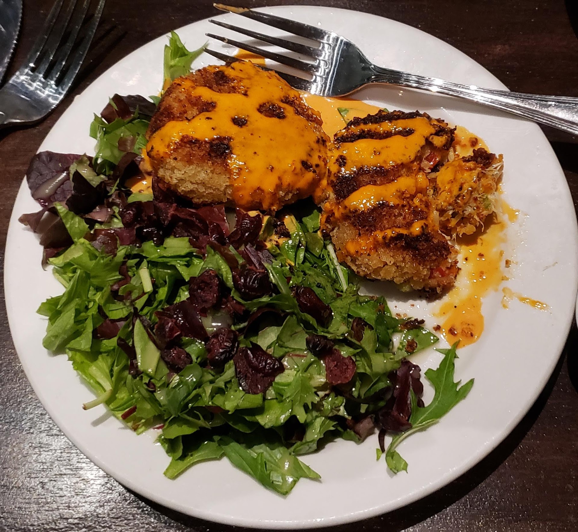 Read moreThis is a nice restaurant that did not meet our expectations. The decoration is sober, simple and elegant. They have a nice variety of spirits and wine. The bar tender prepared a nice balanced gin and tonic. The serverswell dresed, very attentive and cordial. The menu has a interesting set of dishes that is hard to understand what is the chef style or theme. We order the recommended brussel sprouts which were good. They were a little bit charred with a sweet and sour flavor and interestingly perfect combination with shaved cheese. Then we ordered crab cakes. They were very light but the kinda thousand island liked sauce was a disservice to the dish. We completed our order with the blackened catch. It was below expectations. The white fiah flavor was completely lost and wasted under a thick layer of too much seasoning and borderline overcooked. It came with steam white rice thar was hard and seemed to be the left over when you cooked rice in a pot. The mango salsa, other than sweet had no flavor. I can't at this point recomend the restaurant...
