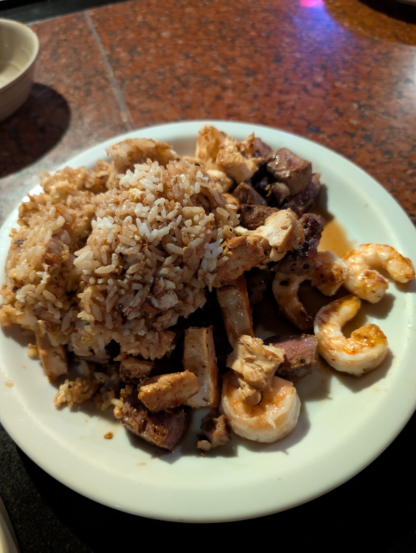 The place is very cozy and smokey so I guess the ambiance is good in the sense that it's very appropriate to teppanyaki. The soup is just like any other teppan places, no ingredients just msg and water pretty much with strings of onion. Salad is also generic like other places. The fried rice and teppan dishes are great, not the greatest I've tried but on the better end of the spectrum: I like my fried rice a bit overcooked and it was just that, the chicken was not too dry (despite all chicken breast tend to be drier anyways) and the shrimp is pretty good ( a bit overcooked). The chef Roy was full of energy and did quite a number of tricks to please the kids in the next table. Overall a great effort and we finished all the food. A solid spot for sure!