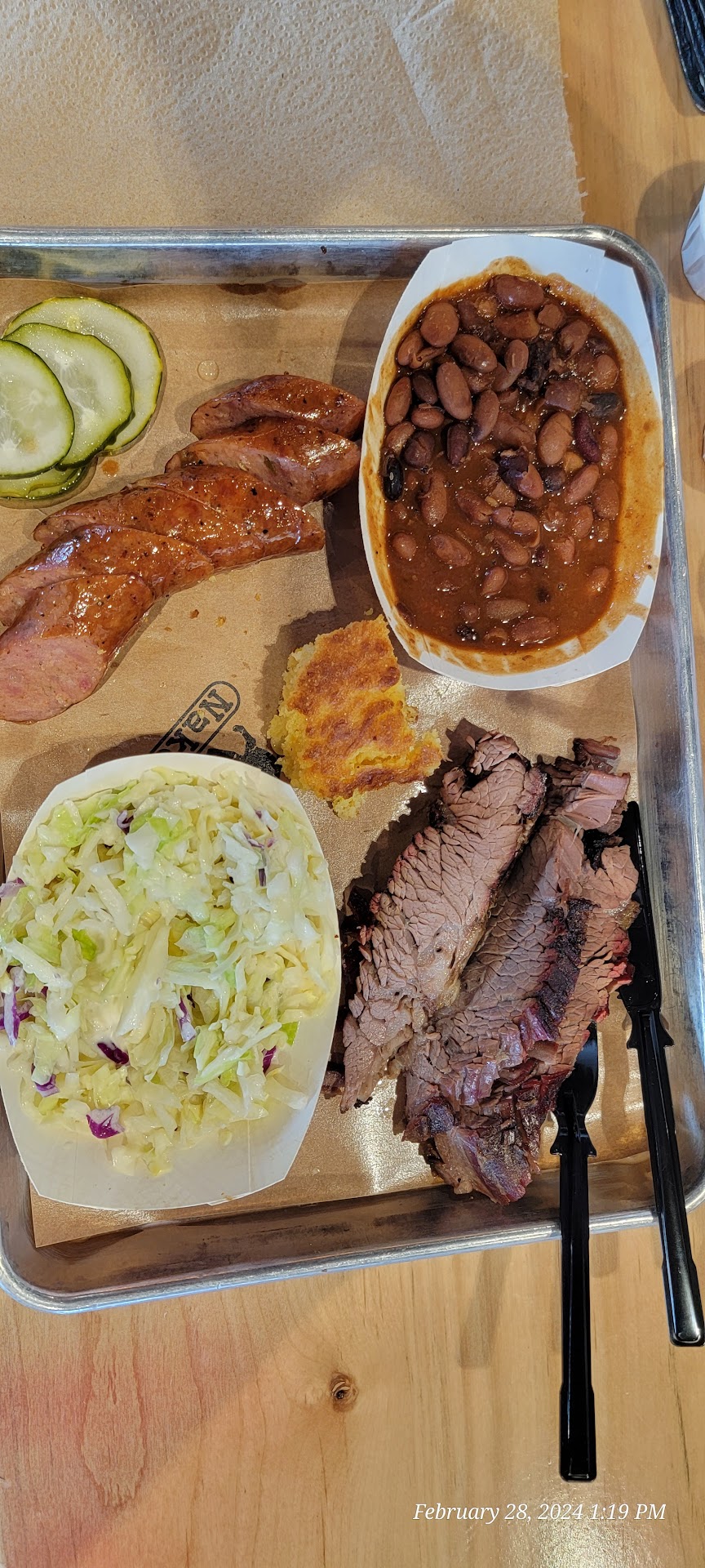 I had the brisket and the hot link with beans and Cole slaw and a piece of cornbread. The brisket did not appear to have been smoked. There was no smoke ring and no smoky flavor. It had very little flavor, rather bland. The jalapeño hot link had a very good flavor but not much heat. The beans tasted like canned beans, nothing special. The Cole slaw was not the best I've ever eaten but not the worst either. It was rather average. The cornbread, being the least expensive item to prepare, should have been a big square and a couple of inches thick. I was disappointed when they served me a 2x2 square that was about an inch thick. However, after the first bite I was okay with not having a larger piece. There wasn't anything special about it. Honestly it was a little disappointing. My wife had the pulled pork and the ribs. She said the pork was very greasy but she liked the ribs. The meat came off the rib bones nice and clean without falling off in your hands. So kudos on that. They had a Sweet and a Spicy sauce. The sweet sauce had the best flavor. However both sauces were as thin as water.