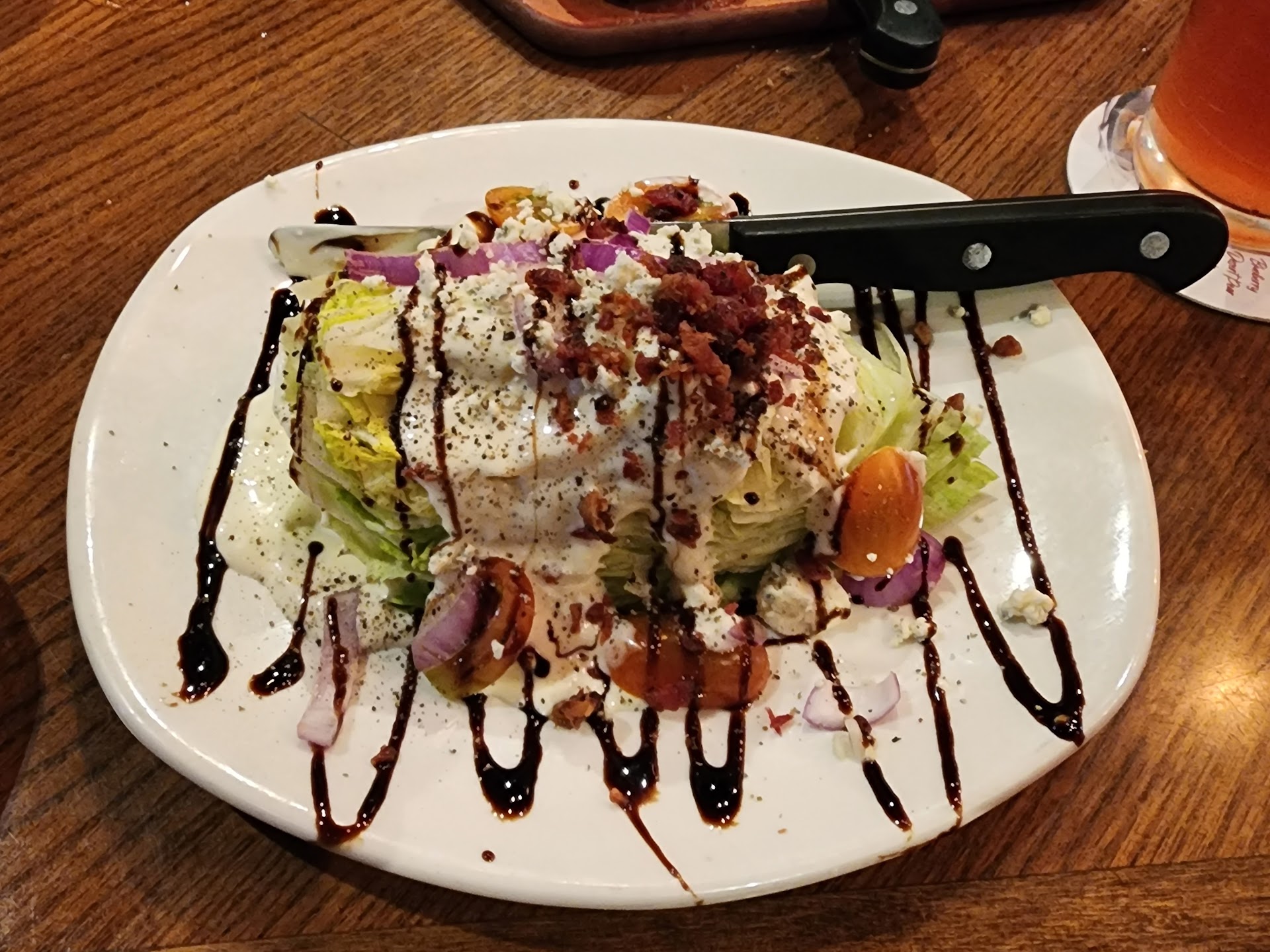 I ordered 12 oz ribeye steak well done (it was burnt and completely dried out and flatten), baked potato with butter and green onions (It was way too soft and mushy to the texture, could taste that it was boiled or something), a wedge salad (too saturated with the blue cheese and not sure if the dark sauce was balsamic dressing but I didn't like the taste of it). Since my friend's paid the bill I didn't want to complain about my food.