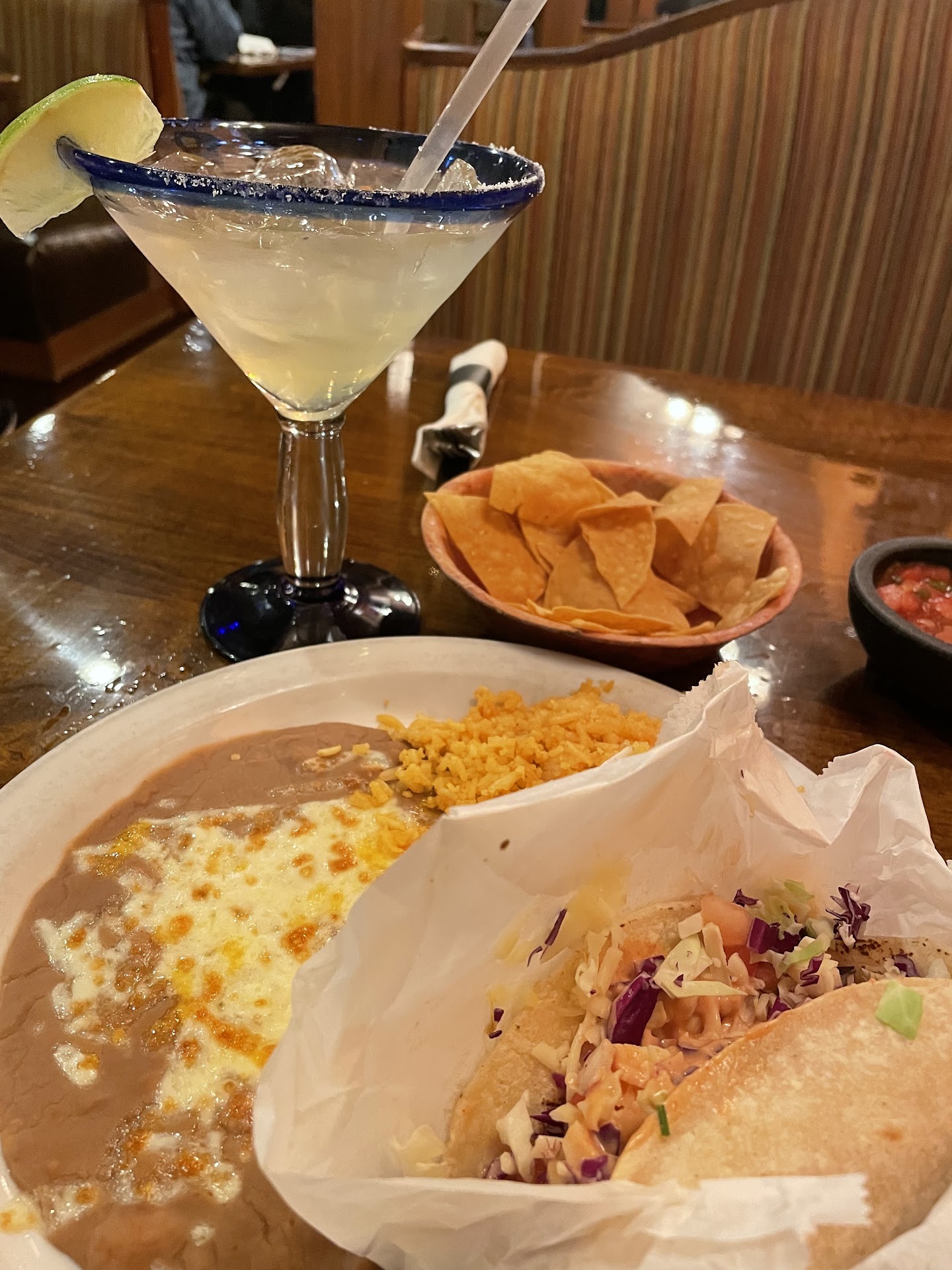 Indoor and outdoor seating was available. Outside tables very well spaced. Ordered the sampler platter appetizer to split between two. It was massive! Should have ordered the small. The flautas were plenty and meaty and the quesadilla was cheesy. I would have preferred less beans on the nachos but there was cheese a-plenty. Free chips and salsa. Salsa was decent with fresh chunky ingredients. Ordered side of guac that was okay. We could have used a side of salsa and hot sauce with the platter but they provided the salsa when asked for. Service was pleasant and attentive but not overly. I had a blended passion fruit margarita which was just the right amount of sweet and tart and fairly large and she had the michelada. We are used to a more basic version than we've had here in California. (Chili-lime salted rim with some squeezed lime juice, ice, mexican beer and tapatio.) Here in cali they use clamato which is kinda gross and they also have used a tamarind syrup which is also not a preference. The passion fruit rita was a nice change from the overly sweet fruits usually used in fruity styles though they were on the menu also. Even in blueberry. They do have a happy hour that ends at 6 with affordable house rita's and other drinks along with food specials. Will be coming back for drinks and to try some of the other dishes since it is not to far...