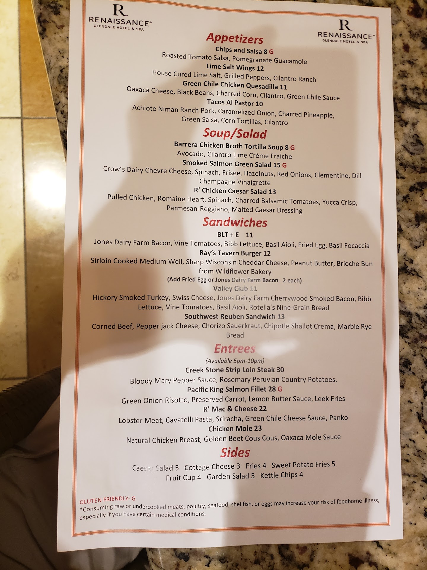 The restaurant was great with great food. I ate there for breakfast buffet which included eggs, bacon, made to order omelets, fruit, cereal, waffles and pastries for $18. Lunch was great and I had a hamburger with fried egg and bacon. Wish they had some more staple food as my 11 year old doesn't really like "fancy " food and kids meals were not enough food. She tried an appetizer quesadilla but it was with white cheeses and wasn't crispy and she did not care for it although my boyfriend and I did. Dinner was good but slightly frustrating. We had tickets for a 7pm concert at the Gila River Arena. We arrived for dinner at 5:05pm. It was 5:45 before we got our drinks. We then placed our order. It didnt arrive until 610pm and we were concerned as we also had to change and walk to the concert. We placed an appetizer order which we were glad they forgot as we wouldn't have had time to eat it. My boyfriend and I got steak and my daughter got a kids chicken tender meal with fries which they were willing to add an extra strip to. Other customers were getting frustrated and were in the same boat. My daughter and I went upstairs to change after eating while boyfriend paid and met us upstairs. The staff was kind and wonderful but felt they were not prepared to handle a large crowd of people. This can be troublesome as it is next to the Cardinals Arena and Coyotes Stadium as well as Westgate which all have large events often. We also got room service after which had an hour wait but food was wonderful. Ordered appetizers and salad. Would recommend but arrive extra early if eating...