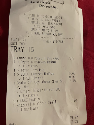 Ā Ā Ā Read moreSo I am not the one who usually complains about much , understand life and ish happens. Never know what someone is going through . Now with that being said , this sonic for the longest time was great . More well made fast food vs Service but overall great up until recently. Tonight was the last night I will visit that location and itās right down the street from my house. We went there to of course get some drinks and food, ordered in no particular order Large Cherry Limeade , Large Sweet Tea , water , quarter pound cheeseburger, mozzarella sticks and a corn dog doesnāt seem like a particularly large order , well it took 15 minutes for everything to come out keep in mind fairly decent busy night . We head home which again down the street and was extremely disappointed on the quality of the food/drinks. Cherry limeade was watered down as well as the tea, mozzarella sticks were cold and texture of the cheese was rubbery . Corn dog, fries same and the burger was decent . Spent 20 bucks including tip, wife went back to just disappointing service . The server who brought out the food was nonchalant , tried to make it seem as if we were making up a story trying to get free food . That wasnāt the worst of it , she didnāt get an apology. Simply said āoh we were really busyā šš .. huh? They unsuccessfully attempted to redo entire order. Limeade was sprite with cherry food coloring , tea was a small everything else was better . Overall I loved sonic , I was a former employee but tonight was the last night of us going to...