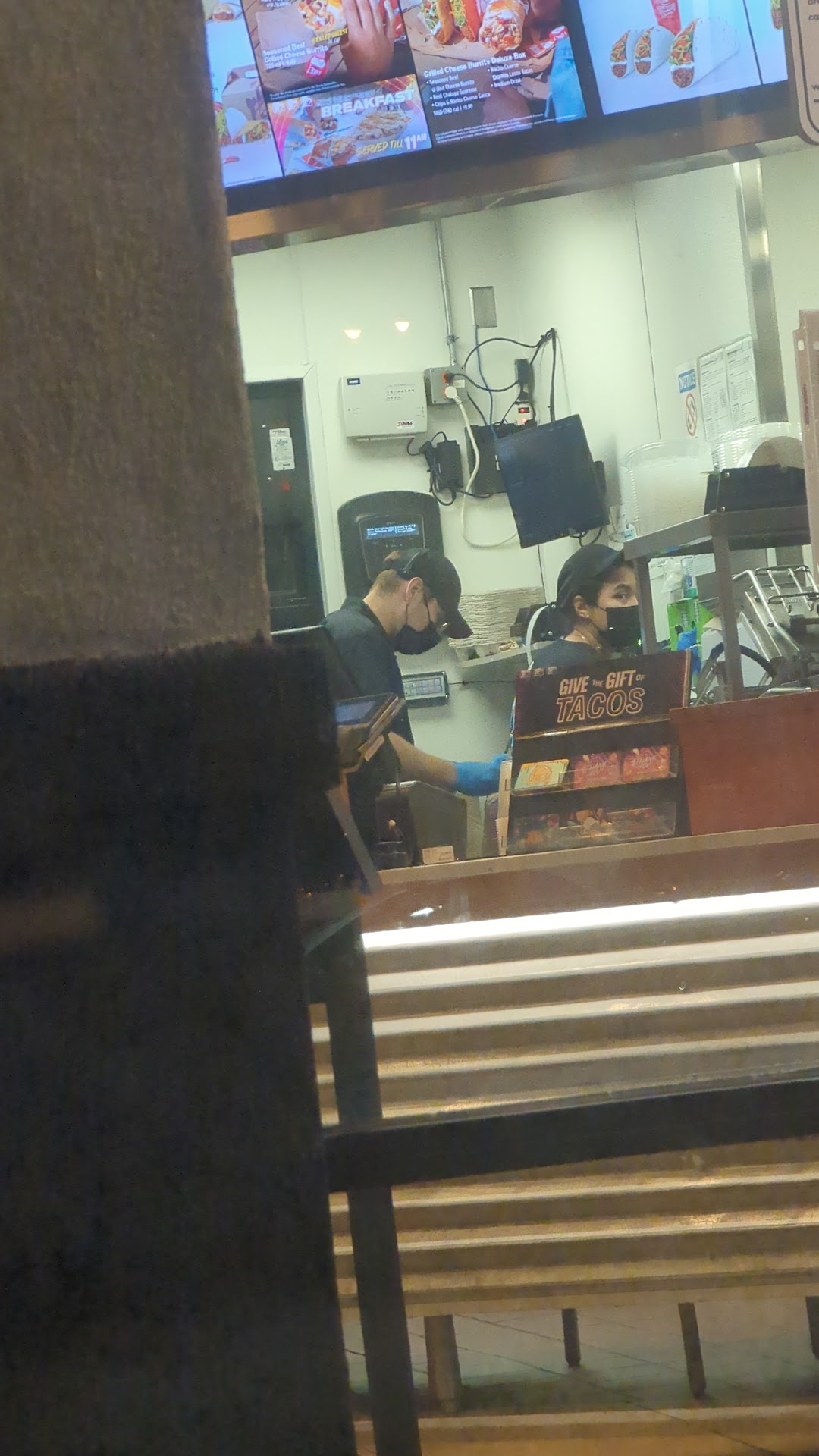 Read moreThis is an awesome Taco Bell. The staff is amazing and super nice. I forgot to check the guy's name but the tall white guy with glasses is extremely kind. They work together as a team to make sure you get your food on time. Really happy with this visit. I was doing Uber eats. The guy with the glasses was kind enough to give me the bathroom coat so I can use the bathroom because he knows I'm on the road most of the time so I'm extremely thrown off by that because nobody else has ever done that like voluntarily. Anyways, two thumbs up for this Taco Bell. The guy in the picture is the one I'm talking about. I hope it doesn't get mad that it took a photo of him but he deserves to be thanked by Taco Bell because he said a high standard for them for great, superb, phenomenal...