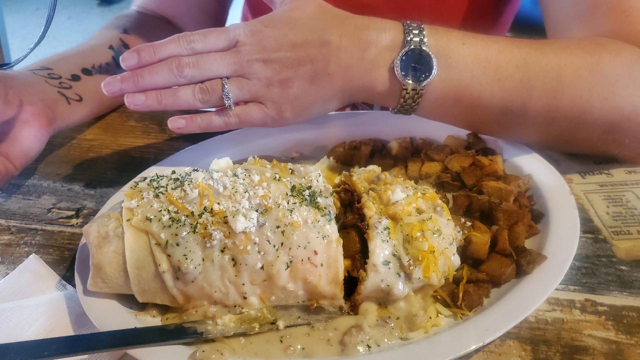 Read moreWe have been here a few times now just for the food. First time I had the Mac n cheese topped with pulled pork. It had crushed flaming hot Cheetos sprinkled on top of the fresh homemade Mac. Absolutely fantastic. Came back for breakfast. Pictured is the breakfast burrito filled with chorizo, brisket, two eggs, bacon and country fried potatoes usually it's smothered with green chili, but I got it smothered with homemade sausage gravy, came with a side of country fried potatoes. Hands down best breakfast burrito I have ever had. My husband had the country fried chicken topped with over easy eggs and chorizo gravy with a side of country fried potatoes and bacon. If you have not tried their food you are missing out!! And the cook comes out and asks how things are and wants to get honest feedback and opinions. Fantastic that he cares - you can tell by the...