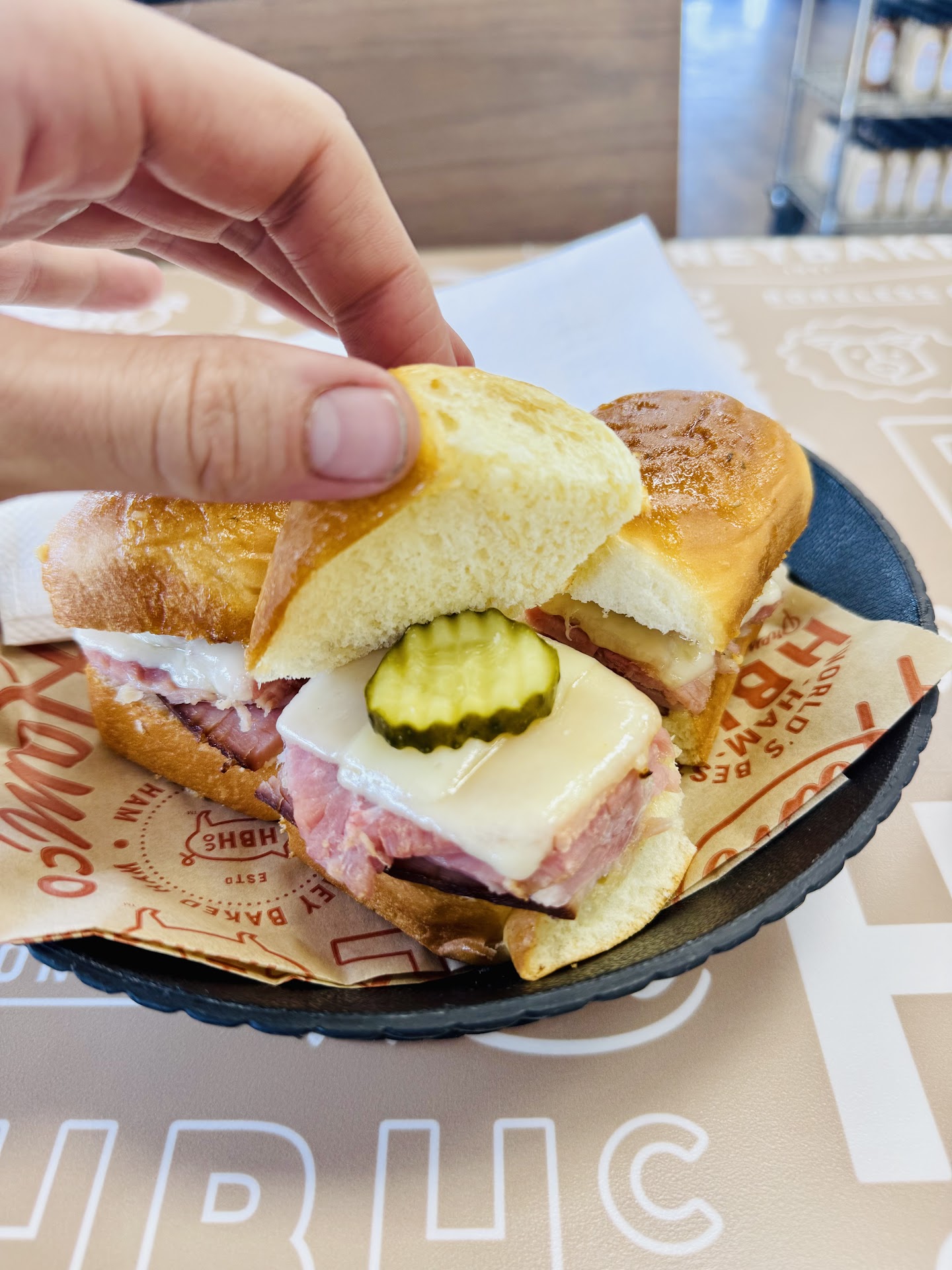 What a wild experience! I 'reserved' a ham for Thanksgiving dinner and picked it up Wednesday. I've never done it before and doing it for this holiday may not be representative of the usual experience here! They were so busy they had someone standing by the entrance to direct customers to a different entrance because of the way they were set up inside. One long line was in front of the counter where you tell them what you want or give them your reservation order number and of course, you can add items to the order. There were (I think?) six employees behind the counter and they called the next customer in line as they finished with another customer. It went SO FAST! From there you got in line to pay, and again, IT WENT SO FAST! I don't think I was in there more then ten minutes. They are so well organized and work so well as a team, everyone was cheerful and smiling. It was great! The ham? I bought a quarter ham, and it lived up to the reputation their hams have. I am not certain, but I think the crusty topping, which was in little chunks here and there, were supposed to be honey glaze I THINK. I never heard of leaving a ham to warm up at room temperature instead of heating it in the oven, but that's what the directions say. It was too cold near the bone for our liking, so I did heat it a little, but not for long. The glaze never did anything but fall in between the slices, so I don't understand how that's supposed to work. Over all, and very good experience, albeit expensive, but I expected that ~ and it after all a special occasion! Added two days later: GREAT sandwiches came...