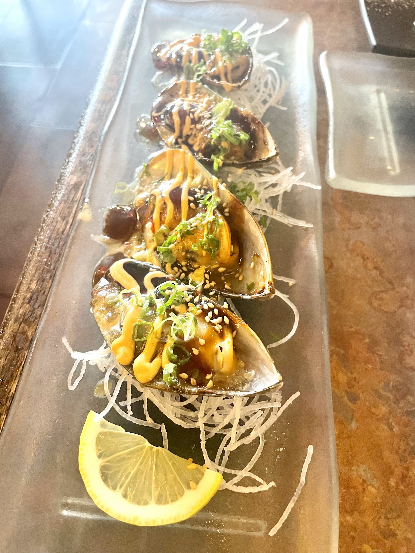 When the order came in, I was pleasantly surprised to find everything to be quite tasty. Dragon roll, Crunchy California, Shrimp tempura, California and mussels all came out fairly quick. Delivered to us in a no nonsense, here is your food, and don't bother me, kind of way.