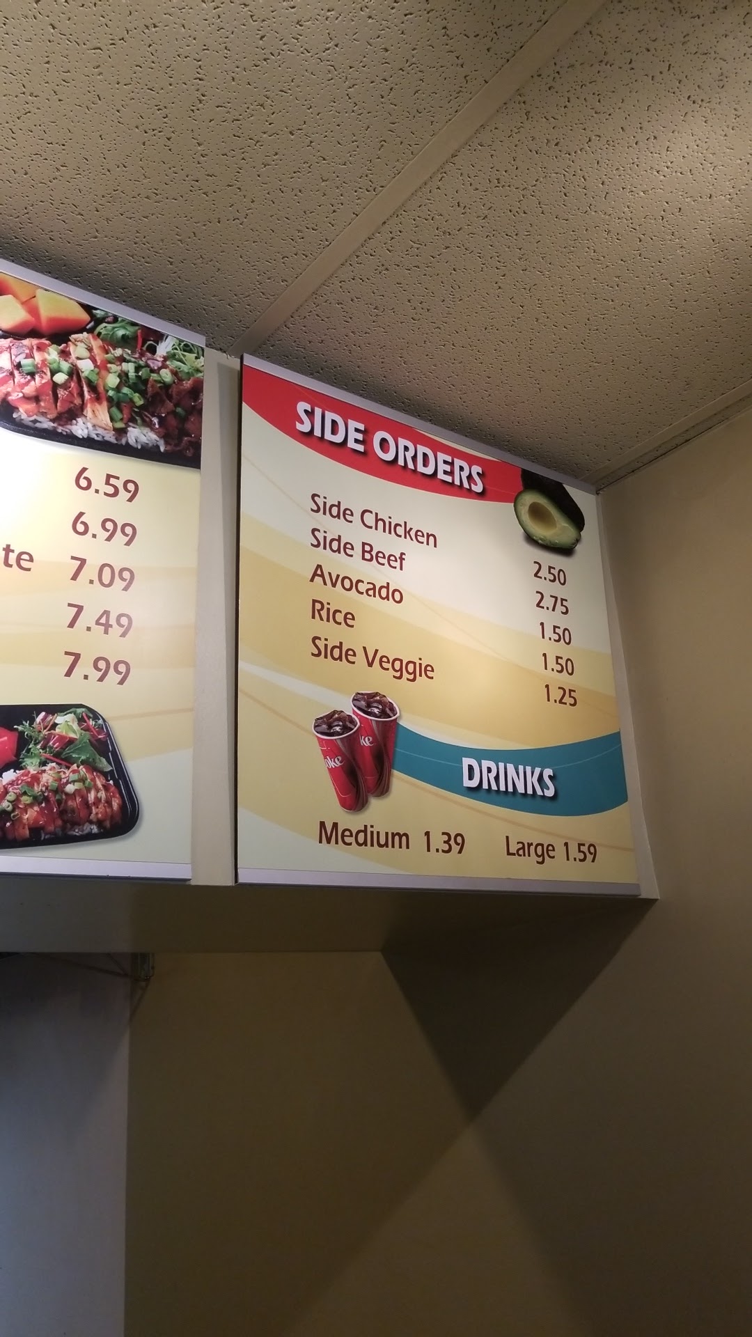 The prices are very reasonable and the portion sizes are generous. I always get the beef and chicken bowl with veggies on the side and it is plenty of food for me.