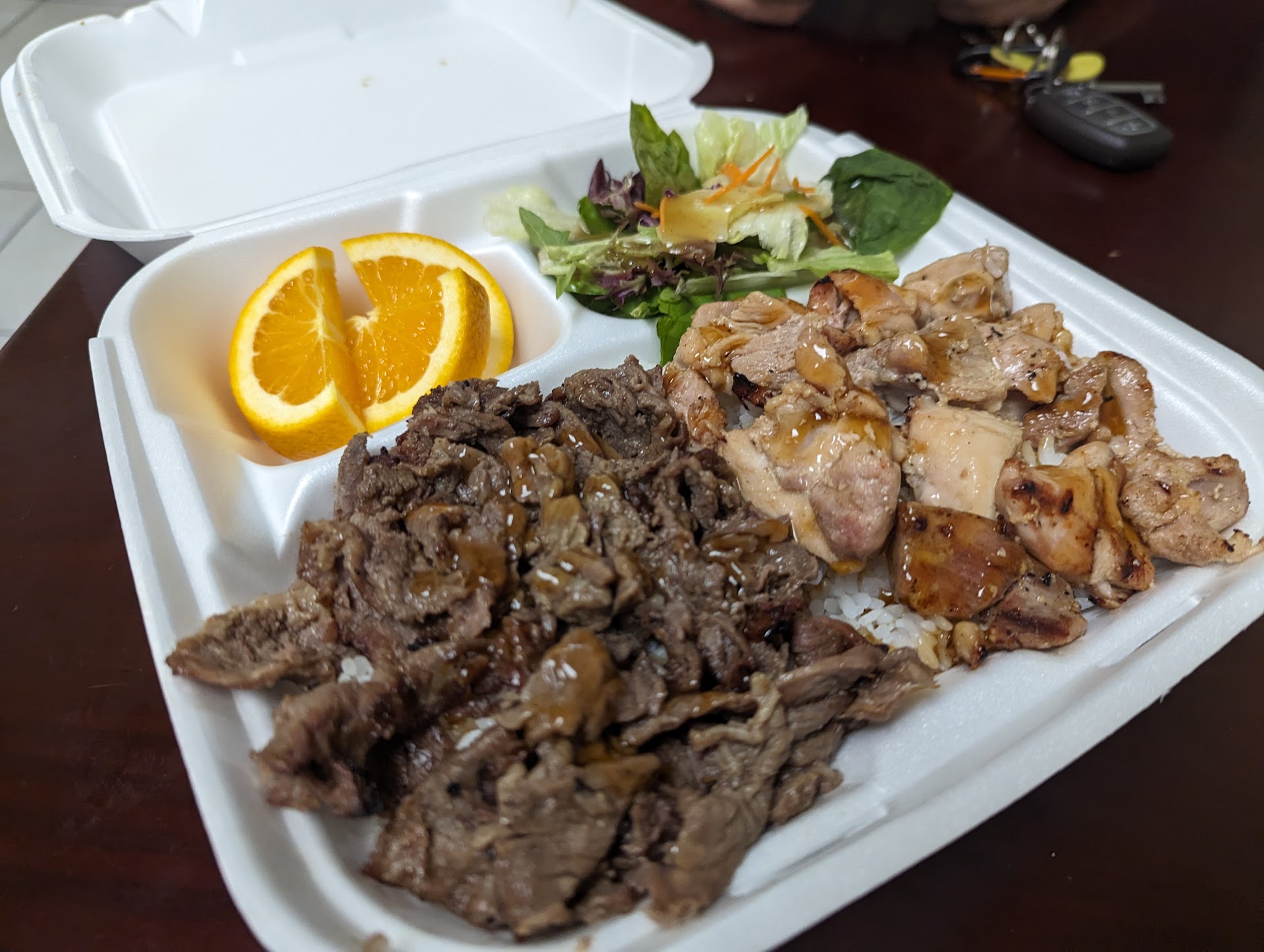 I ordered 2 lunch specials, a dinner meal (beef ribs) and an order of California rolls. The woman who answers the phone cannot understand the English language very well and it made it difficult to order. I had to start my order over several times because if I asked a question about any part of a meal, she would assume that I wanted it and added it to the order. It discouraged me from ordering anything else since I had no menu to order from. Also, I at the end of my order I asked if everything (each item) came with salad and she replied yes. I even told her how good the salad is and she giggled and said thank you. My son picked up my order for me and when I looked, there was no salad. I called and spoke with the same woman who had no problem speaking English well enough to understand me and to tell me that not one item I ordered came with a side salad. There are way too many Teriyaki restaurants nearby to put up with that sort of thing. The only reason i gave 2 stars is because the food is decent as Teriyaki goes. Next time I will try another spot. I don't feel like going through that again. As I think about it, I better...