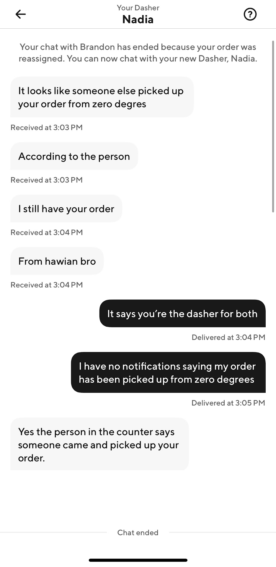 Another response smh: original dasher was always Nadia. You guys gave the order to the wrong dasher for another persons order. Next time check the order on the dasher’s phone like you’re supposed to. Just look at your responses! Not one apology ever for any inconvenience. So quick to attack and defend with wrong info. If you read my response , it says both me and the dasher already took it up with DoorDash who has superb customer service. They apologized on your behalf and reimbursed me. Now for the last...