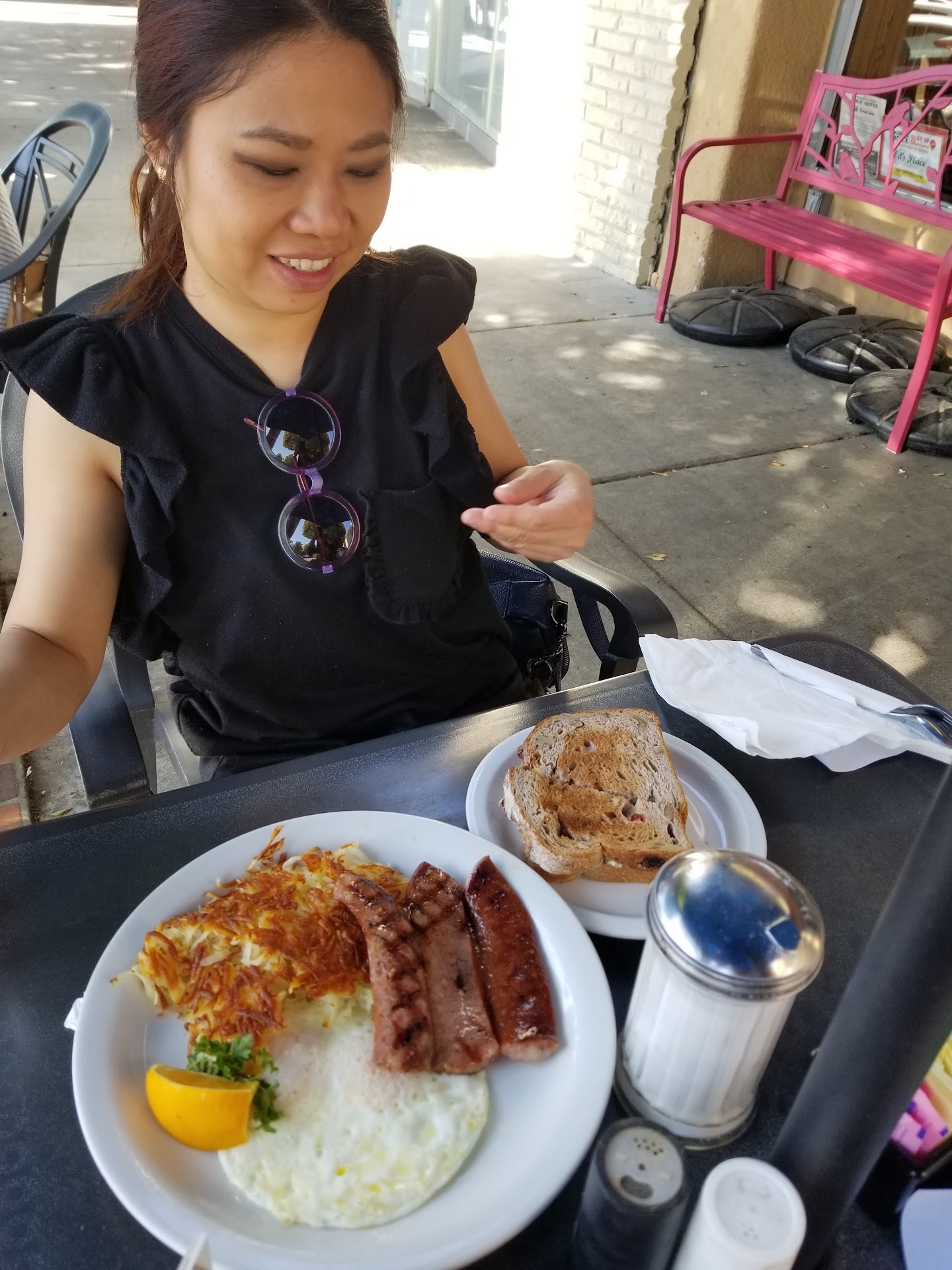 Food is ridiculously over priced, wait staff was nice. But $15 dollars for a slice of bread cut in half(French toast) and its not even texas toast bread. it's just regular bread cut in half, two eggs, and a single sausage is ridiculous. And $20 omelet!?! $10 bowl of cold cereal?!?Just eat at home. My friends used to love this place because in the PAST it WAS CHEAPER, and NOW it's tasteless food at a PREMIUM PRICE. It was VERY CRAMPED inside. The aesthetic of the restaurant was cool but if you keep looking, you'll see all of its flaws. Mostly senior citizens eat here, so bumping up the price and not changing the quality of the meal is doing a disservice by digging deeper into that social security money. My only enjoyable experience was finally being able to leave. SUMMARY: The food is nothing to brag about, the prices are the biggest complaint (at the store for $15 you can 12 eggs, bread, and a pack of sausages for multiple servings. Here you get 2 eggs, a single sausage, and a single slice of thin bread cut in half), cramped indoor seating (outdoor seating is sometimes available), the restaurant needs some cleaning (don't look up). Go to IHOP or Dennys instead, better yet...