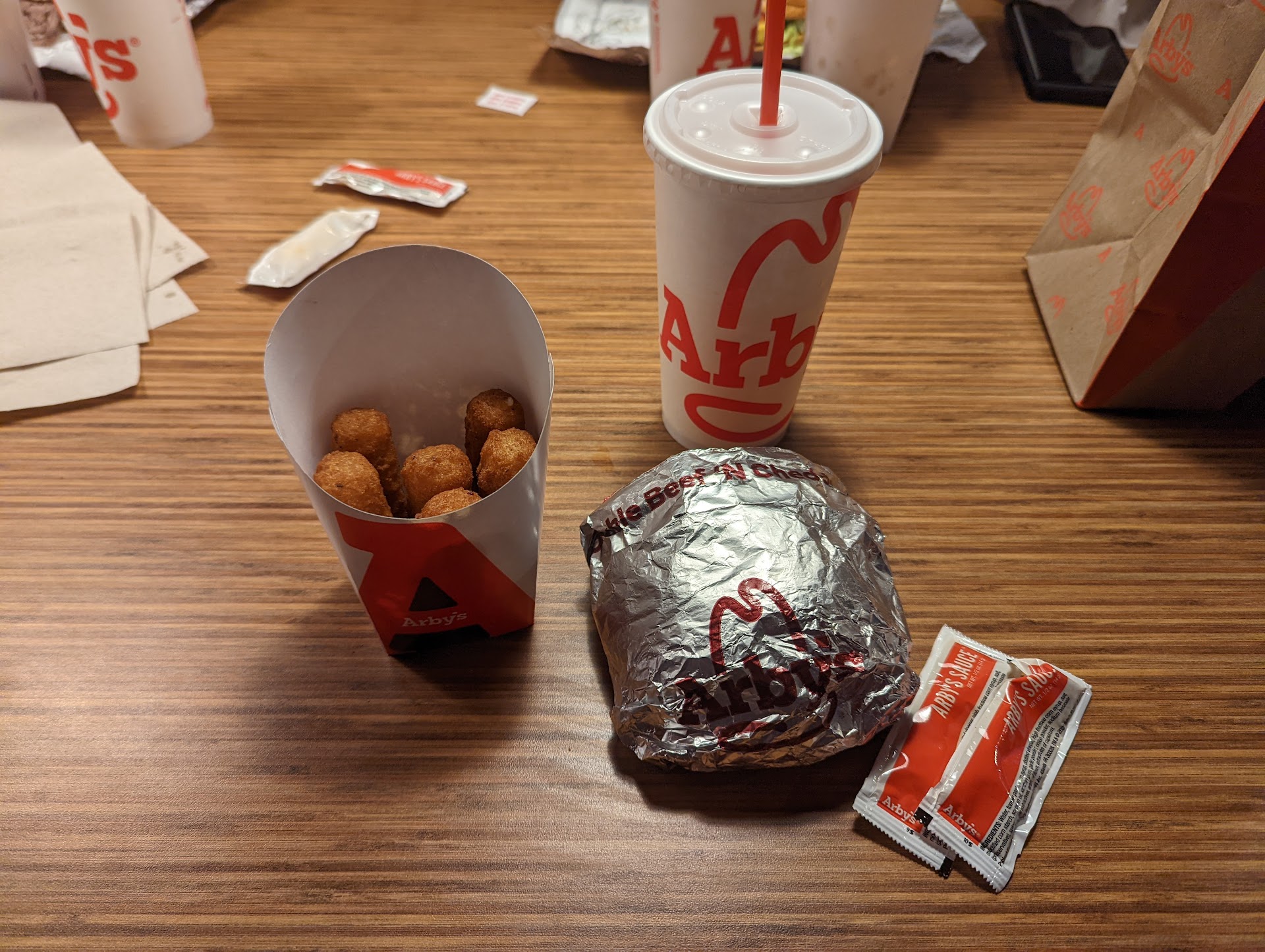 Read moreI had a Reuben at lunch time. My order was taken correctly and in a timely manner. I dined inside due to a lengthy line at their drive thru. The inside was very clean and I was greeted upon entering. I was with 4 of my work colleagues. I was the 2nd out 6 to place my order. After paying for my meal and receiving my receipt I was given my medium drink cup and I proceeded to the fountain drink station. I made a coke with no issues and a lid and straw as well as napkins were available. I found a seat and placed my items in hand on the table. Within a minute or two they started calling our names in the order we placed them, to come and get our food. I grabbed my food and went back to chair and began eating. Everything was great. I was very happy with my meal and the temperature and proportions of meats on my Reuben were perfect. That being said, I highly recommend this Arby's...