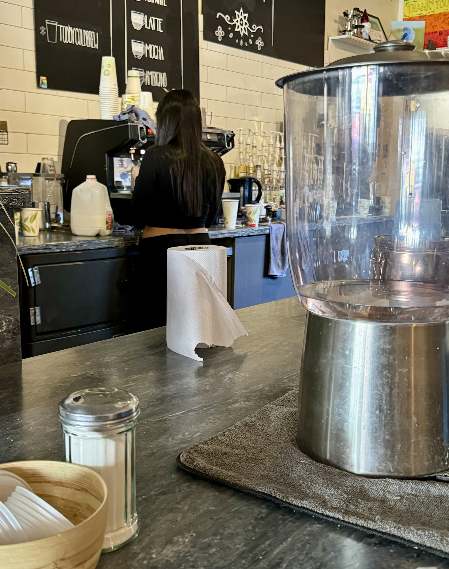 We are Colorado Western Slope residents. This is our second visit to Glenwood Springs and the hot springs. We needed to get lunch somewhere and saw this restaurant on the main street. We checked reviews and they were fairly good so decided to give this place a try. We went in, found a table for six and waited. There was only one other party in the restaurant and it was 1:45pm on Saturday. I finally asked if they had menus and was told no they had everything on their chalkboard which was difficult to read. Then we were told they were closing their lunch but we could order their quiches they had premade in the case. We ordered three quiches, two coffees, and a couple of sodas. It was crazy expensive for just that and we had to order at the counter, find our own silverware, salt and pepper, napkins and water. Can we say no service at all? We looked around and noticed there were bins with signs that said Bus your own table. My son was not done with his coffee and left to use the restroom. My two daughters and myself had picked up our dishes and placed them in the bins. Because we drove separately my daughter and I got up to leave. As we were walking out of the restaurant the clerk YELLED at us to bus our table. We turned around and said we already did that. Then she spouted back, that empty coffee cup and saucer (which was not empty). We told her it was my son's and we didn't know if he was finished and we walked out. My other daughter and son and grandkids were still in the restaurant when the clerk proceeded to tell the other clerk loudly that we had spent $40 and didn't even bother to tip! (the $40 was only my order) I am not in the habit of tipping when I have to serve myself and bus my own table. I've worked hard for my money and am happy to tip where there is service and the staff is polite. This place is way over priced and the "staff" are beyond rude. Do yourself a favor and go...