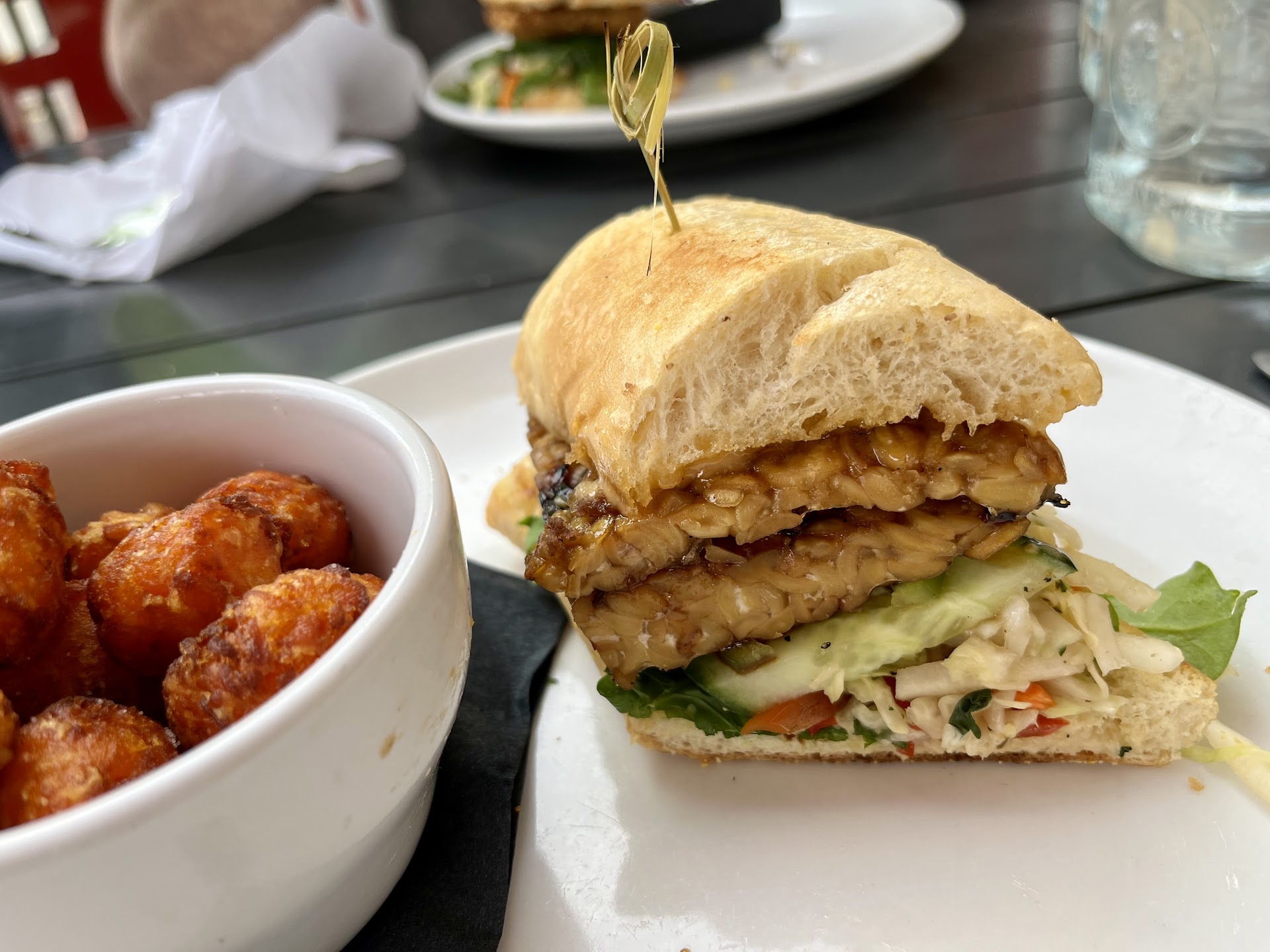 My husband and I both ordered the exact same thing, the Bahn Mi sandwich made with tempeh, and a side of sweet potato tots. Sandwich can also be made without the sriracha aioli to be vegan. (Vegan mayo does exist, but i dont think this place had it, nbd though). The sandwich was delicious and filling, tempeh was prepared wonderfully, we were both so please with our orders. This was actually the first time we have ever eaten tempeh outside of our home which added to how crazy and unexpected it was to find this restaurant. And can i just say the sweet potato tots are literally perfect? Addictive. Perfect size, perfectly cooked. Id take those over popcorn for movie watching. So good. Would absolutely return.