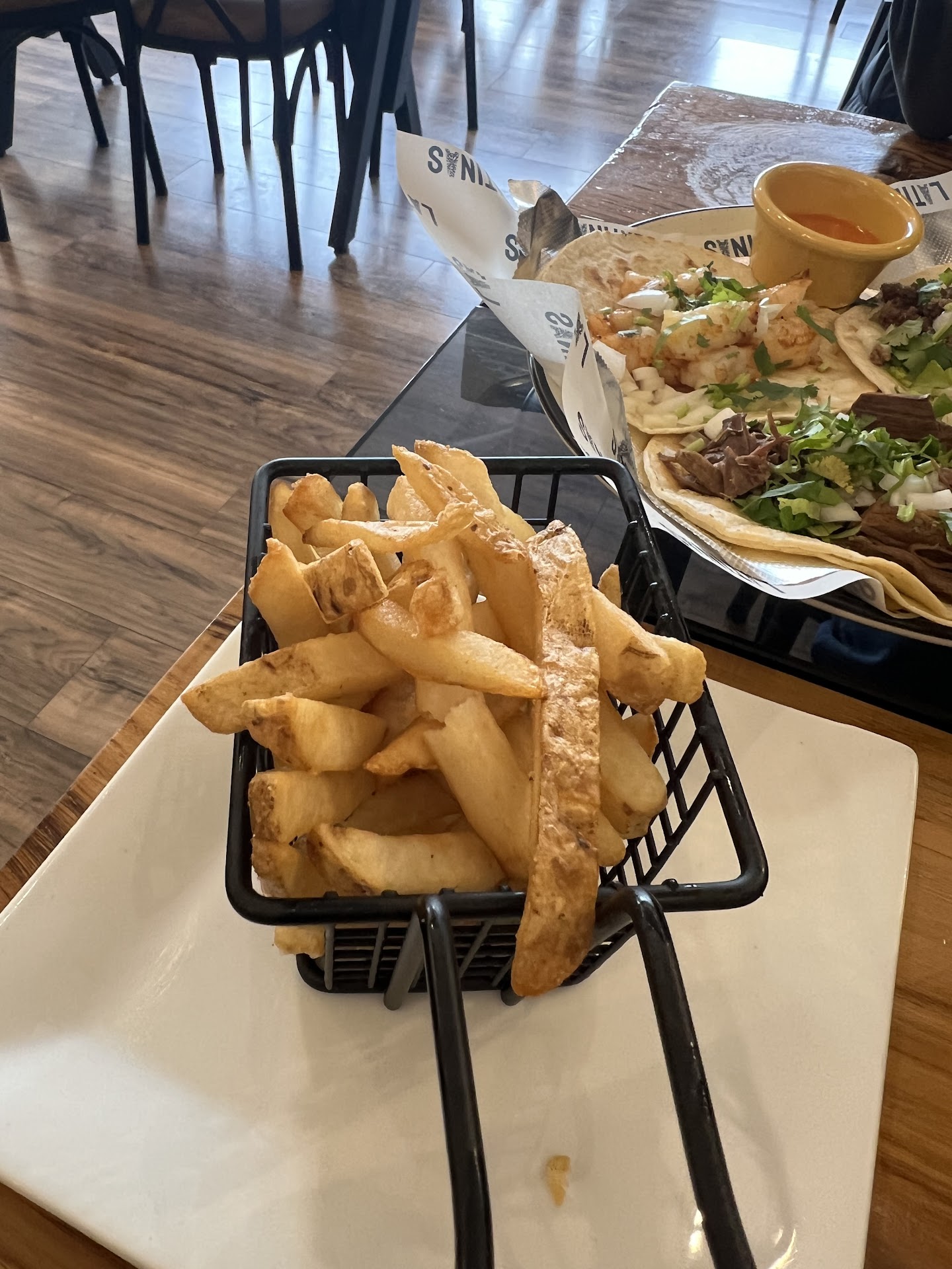 For the main course because we are gluttonous slobs, we ordered a chorizo burrito with chicken, chicken quesadilla, fries, shrimp taco, birria taco, and a beer taco. The flavors were mind blowing. I wasn’t a fan of the beef but I think it’s just me since I never like ground beef unless it’s a burger.