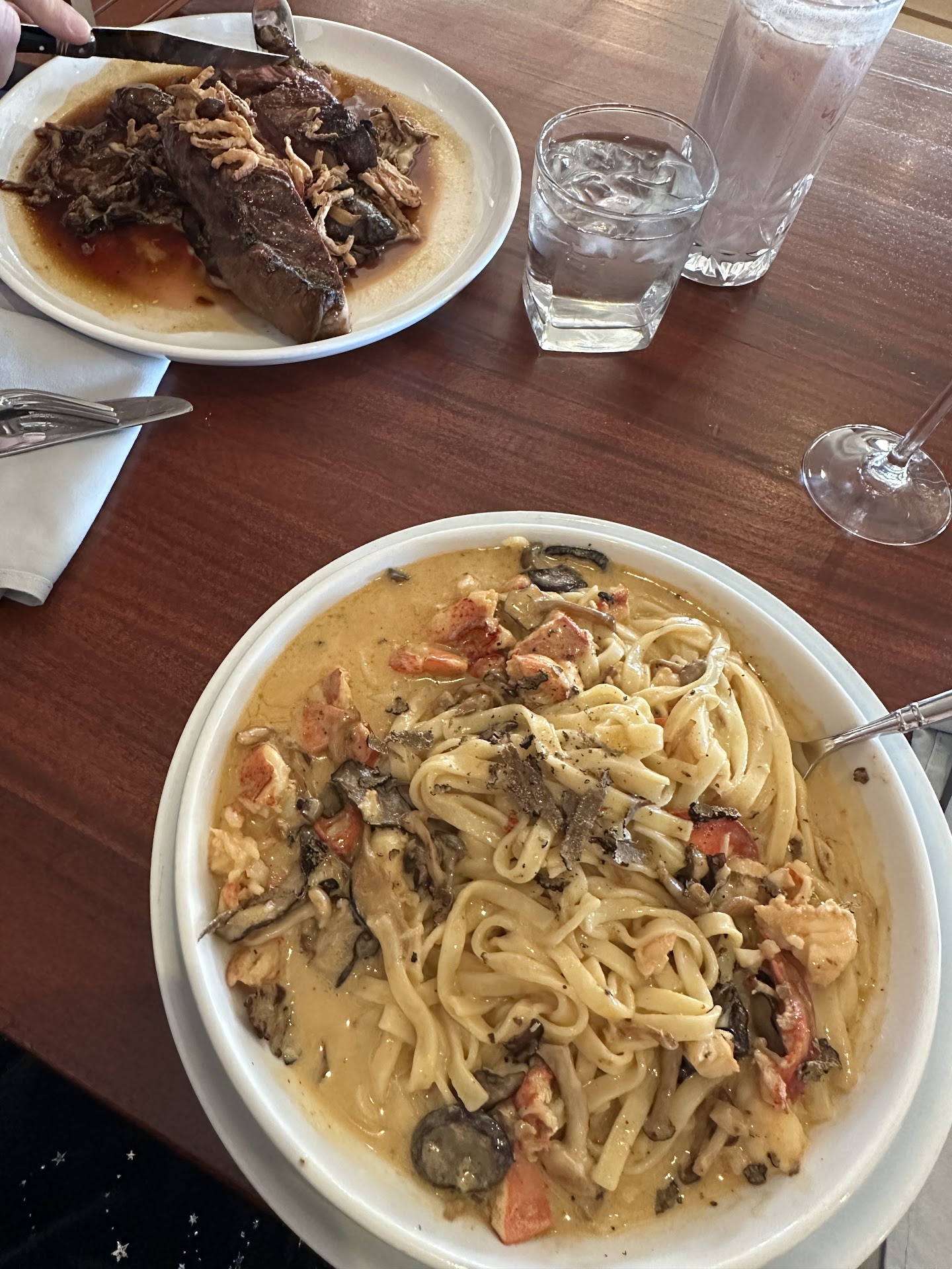 My husband and I were there yesterday for our 1 year wedding anniversary. We actually dined here on our wedding night, a year ago- that’s why we chose this place. The ambiance is nice, great decor, view etc. however, the food is extremely sub par. We ordered the crab cakes for an app- which was good but is hard to mess up. My husband ordered a NY strip, and he stated that it was ok, but was overly salted and was difficult to eat as such. He also said he would have hoped for more out of a $48 steak…. He said that the fried onions tasted like the kind you can get out of a can at the grocery store. He also didn’t much care for the Italian cream soda, that was a very off tasting drink I had the lobster linguine (without pancetta) it was not great. And also for $48 I expected a lot more. It honestly tasted like frozen lobster and had the weirdest after taste. I found several shells in my meal too, which I wouldn’t have expected with those prices. I brought it home as leftovers and tried to save it with olive oil and Parmesan and it did not help. I couldn’t finish it which was a shame, since I hate wasting money and food. The server was nice enough but kind of scarce, and the service was incredibly slow. There were only 3 other parties there when we went and it took about 45 minutes for us to get our food. Also I did observe a lot of staff hanging around on their phones and chatting- which generally doesn’t bother me per se, but I am stating that for a restaurant of this caliber I did expect more. After $175 bill for 2 people, we were very disappointed and won’t be returning for our next anniversary as we had...