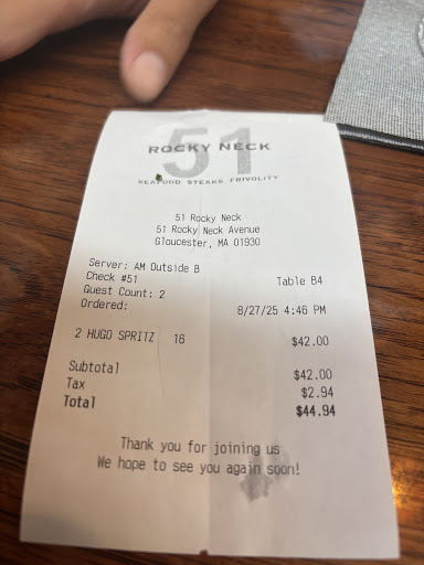Read moreMy husband and I took a trip up the east coast this month, and were on a mission for fresh seafood when we got to Gloucester. We had heard 51 Rocky Neck was a great place to go to satisfy our cravings, and boy was it! It's easy to find the requisite lobster rolls, fried calamari, and raw oysters at just about every restaurant in Gloucester, but this place did it all slightly different, and SO MUCH BETTER! The Frito Misto appetizer is a must, along with the lobster bisque. We only ordered a half dozen oysters, but could have easily eaten a full dozen they were so good. We had great service and learned a lot about the area from the friendly bartenders, and we enjoyed the ambiance and our views from the back deck. Apparently it had been raining a lot the past several weekends, but we lucked out with great weather. If you can sit out on the back deck, I highly recommend it, but make sure you spend time inside as well. It was absolutely beautiful, and I loved all of the paintings from the local artists. Make sure you meet Patrick, the owner. We had a lovely chat, and his knowledge of food, wine and service and his commitment to it all was so refreshing. I look forward to making this an annual stop on our...