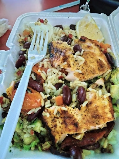 Their 'protein bowl' is SUPPOSED to be a selection of nutritious veg on a bed of quinoa. We got about three-quarters of the listed veg mixed with boiled white rice (no quinoa!) It was warm and the whole lot tasted of grease, like it had been thrown on a griddle and flash fried (a greasy fried salad, no less!) and on top they threw a fillet of salmon that looked like it had also been fried in grease and rolled in some kind of seasoning powder..