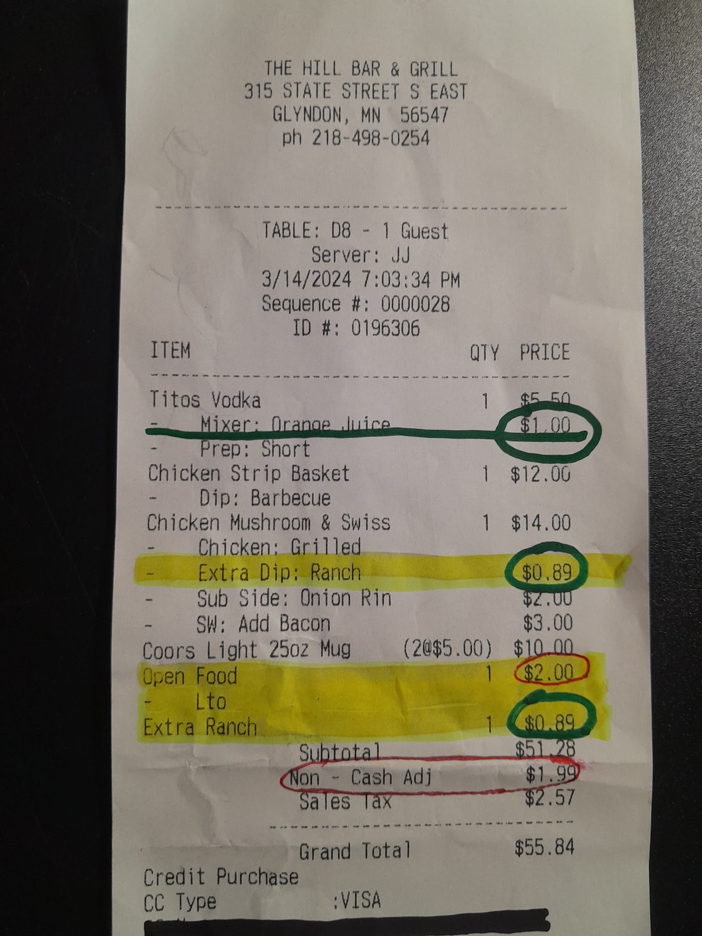 We ordered food as you can see on the photos of the receipt. My mother had a chicken strip basket. With French fries which was a simple.Twelve dollars, and the dipping sauce (Barbeque) was at no charge. I ordered a chicken mushroom and swiss which was $14.00 dollars. I did a few small changes. I opted for Onions rings instead of French fries. The upcharge was $2.00 that was reasonable in my mind. I asked if it was possible to put just a strip of bacon on the sanwhich as well. I didn't think much of it, but I saw on the receipt that is was $3.00 for a strip of bacon 🥓 that's insane to me. The sandwich didn't even have lettuce or tomatoe, so i asked for a piece of lettuce and a piece of tomatoe. I didn't think anything of this. $2.00 for a piece of lettuce and 🍅 tomatoe. Mind blown looking at the receipt. Also on the receipt it says (EXTRA DIP RANCH TWICE) these were not extras the sandwich and onion rings didn't come with any dipping sauce, so an extra charge there again. So to add my sandwich and onion rings up the totsl cost $21.00 dollars and an extra $1.78 for a tiny amount of dipping sauce. Thats insane in my mind!