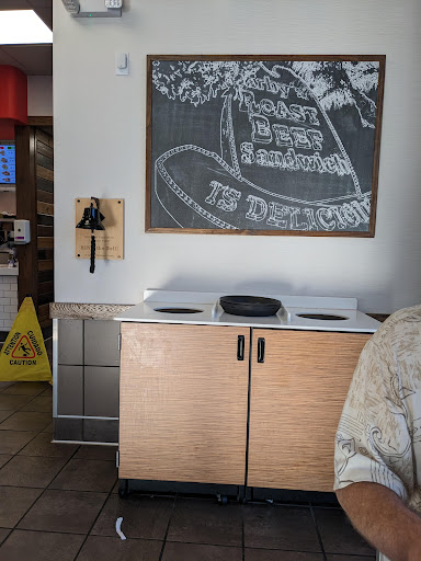 We waited for quite a while for the manager;I guess) to come in so she and the customer service girl could go to the safe to get cash. Manager left (four people in line wanting to order). Girl counted the money. Then she left again (maybe to put the extra cash in the back somewhere). Took our order. I went to get Arby sauce and catsup horsey. Dispensers were empty. Told an employee who had come out to get himself a soda they were empty. He did not acknowledge. I heard the girl yell out something but didn't hear what she said. I went to tell her about the dispensers and she said "I heard you tell him. They will be put in your tray when we bring your order". I thanked her and sat down chastised. They called our order, my husband went to get it. No sauce packets. They were not on the tray and they didn't bring it to us. I went back up to get them. Tables were dirty. An elderly lady came in about the 5 for $5 deal Ava the gal said "We don't know nothing about that. You have to do it yourself". Because I had stood there at the counter and ordered my 5 for $5 online, I ran up to help her do her order. Employees should really be trained how to use the app. They're young and learn quickly. We're old and not so quick. Service was slow. Customer service and friendliness not so good at this particular time we were in on June 12, 2024 at noon. However one slender black man with glasses was very running circles around everyone, running orders to the front. Clarifying orders ands apologizing. He should be rewarded. We're visitors but my sister goes often. Even she said this was worse...