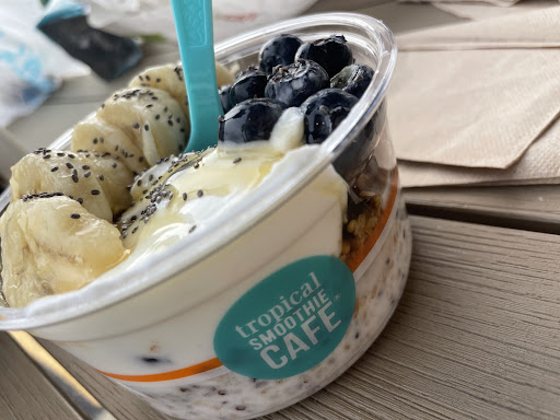 We tried Tropical Smoothie Cafe last month for the first time & we were so impressed! I had the chia pudding bowl, my husband had a wrap. Both were delicious! We’ve since been back and tried many of the breakfast items - everything has been fresh and yummy. When you order food you can add a smoothie for $5 (pretty large!). The establishment is spotless with ample seating, and they have 2 tables outside too. The menu is clear and has nutritional info listed as well. Service was fast and friendly. We...