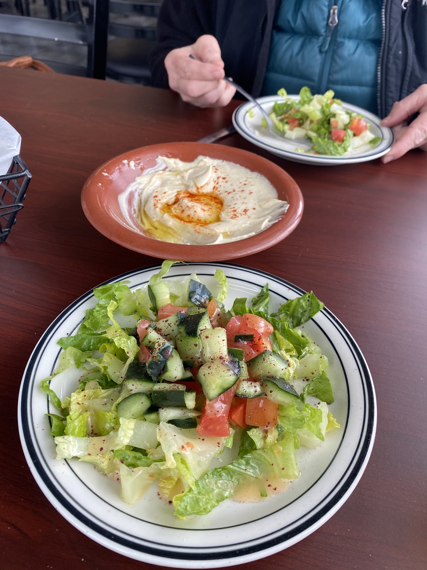 They first brought the salad, which was a tiny plate’s worth—not even a bowl. Then came the pita bread and hummus. The hummus tasted good, but they literally “lined” the bowl, so there was barely any, and the pita wasn’t made in-house.