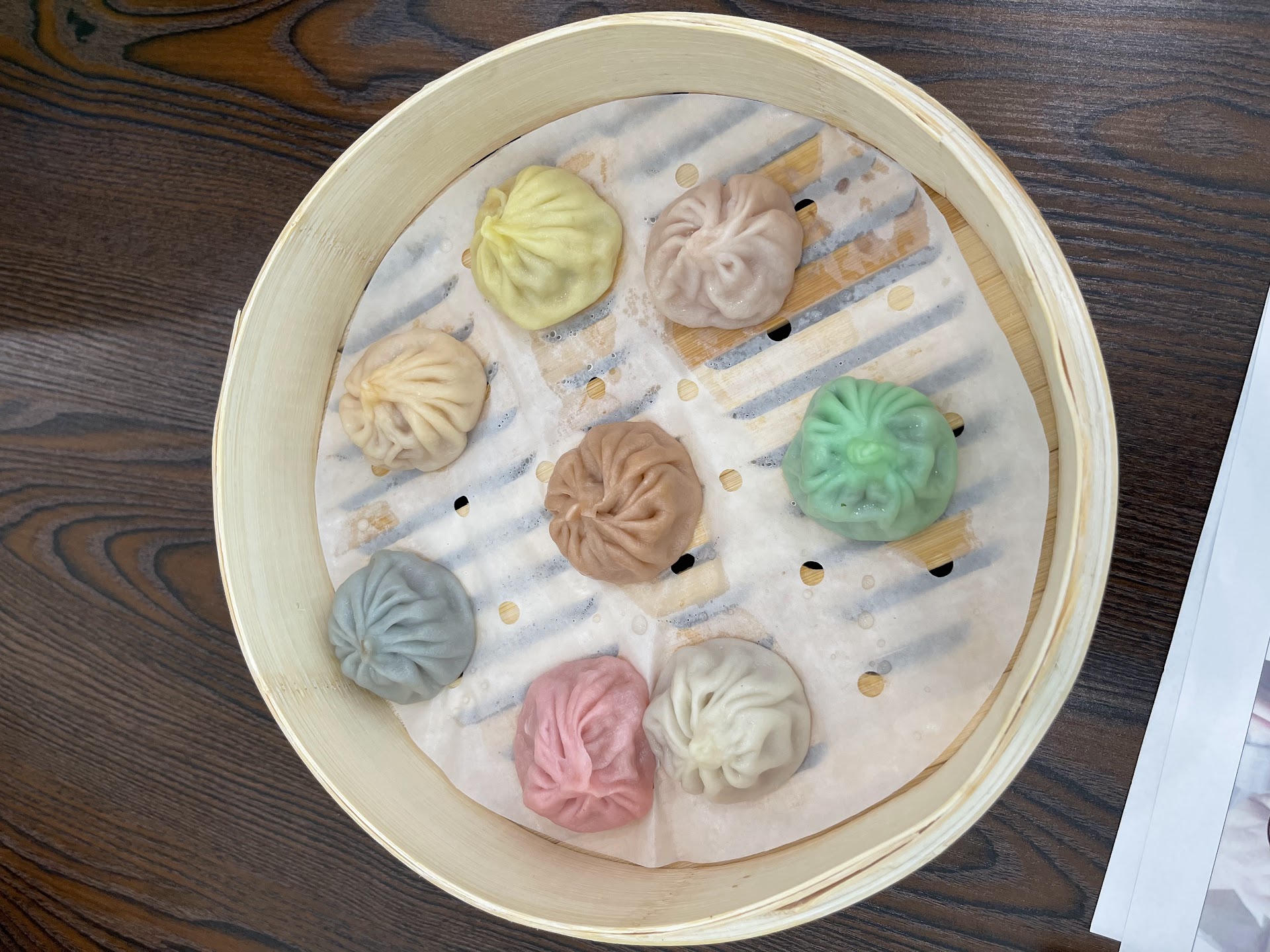 After seeing how the dumplings were prepared behind the counter: rolling out fresh dough, adding the meat mixture, and making them into dumplings, we decided to get the specialty xiao long bao—8 regional flavors: 8 different colors, 8 different fillings. All were delicious!