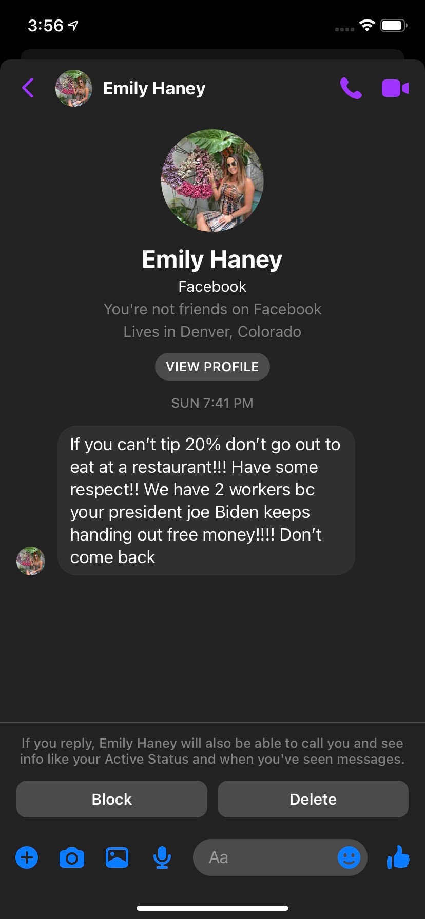 To be honest, I would easily forgive all of the above. One thing I will not forgive is you reaching out to my family via Facebook messenger to complain about the 6$ tip we gave you on a 55$ bill. Finding his name through his credit card receipt. Extremely unprofessional shows you clearly don't deserve a better tip.