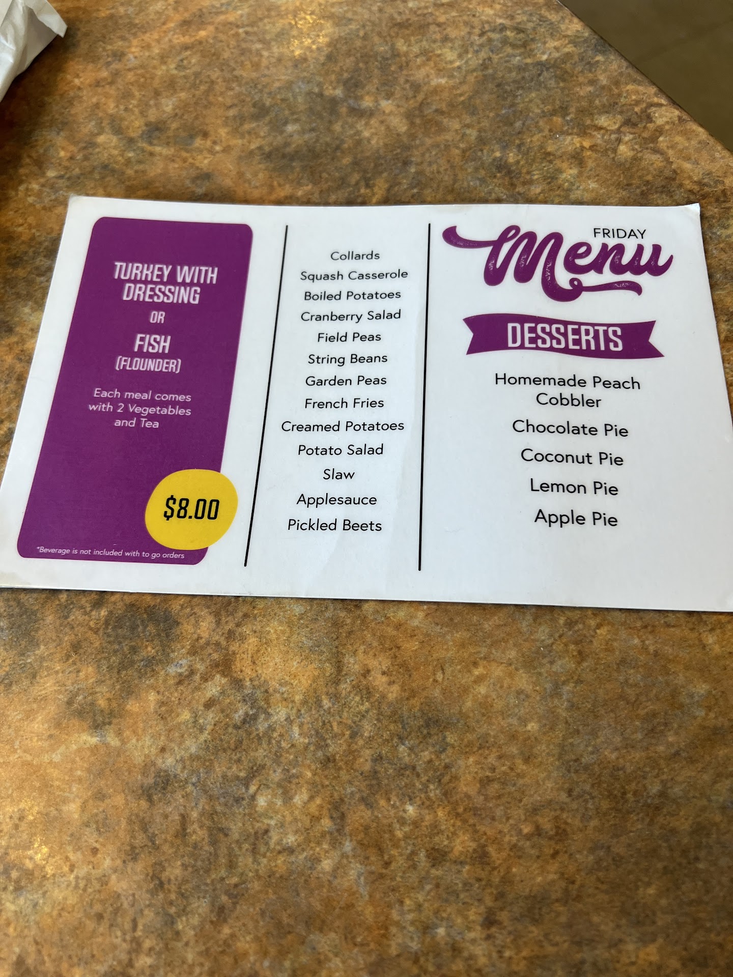 EACH DAILY SPECIAL INCLUDES CHOICE OF TWO COUNTRY STYLE VEGETABLES OFF A LIST OF AROUND 8 CHOICES:(The choice of Side Dishes rotates daily with notable choices of Squash Casserole, Broccoli Casserole, Layered Salad, Marinated Cucumbers, Picked Beets, Cabbage, Boiled Potatoes etc). ROLLS OR HUSHPUPPIES, AND COMPLEMENTARY ICED TEA!! These Specials are an outstanding value at time of review the price is $7.50 TAX INCLUDED!!