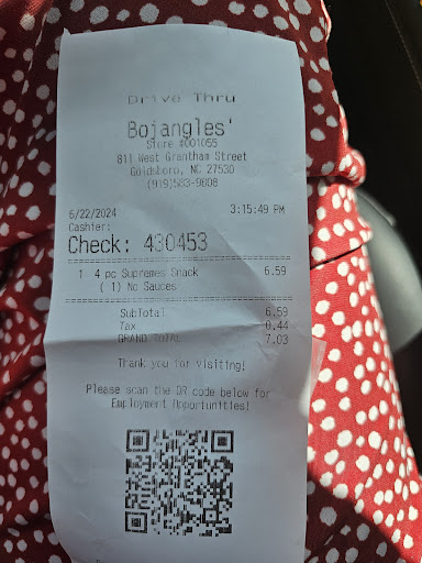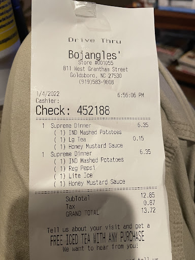 Read moreThis is the worst Bojangles to get food from at dinner time. My fiancé and I have had it with this place. Almost every time we come here for dinner there is something wrong. Either the order is incorrect or the food is cold and sometimes both. I had to convince my fiancé to come tonight and it was a mistake again. She had to repeat her order back to the cashier 3 times and they still got the order wrong! Our order is always $13.88. We ordered a large Pepsi with light ice, a large sweet tea, two four piece supreme dinners both with mashed potatoes and honey mustard. As per the picture you can see they charged $13.72. They tried giving her a small Pepsi and fries in both boxes. They corrected those two issues with attitudes and when we got the boxes home we noticed there were only three piece meals! The place was a slop box as well. The floors were absolutely disgusting. The chicken was cold and the mashed potatoes cups barely had a scoop in them. No utensils. I would really like to know who does the inspections here to give this place a rating in the 90 percentage range. We will never come back here again. If I could give zero stars I would. I would not post my receipt if I wanted them to try to fix a one time mistake. This is an ongoing issue and it’s like...