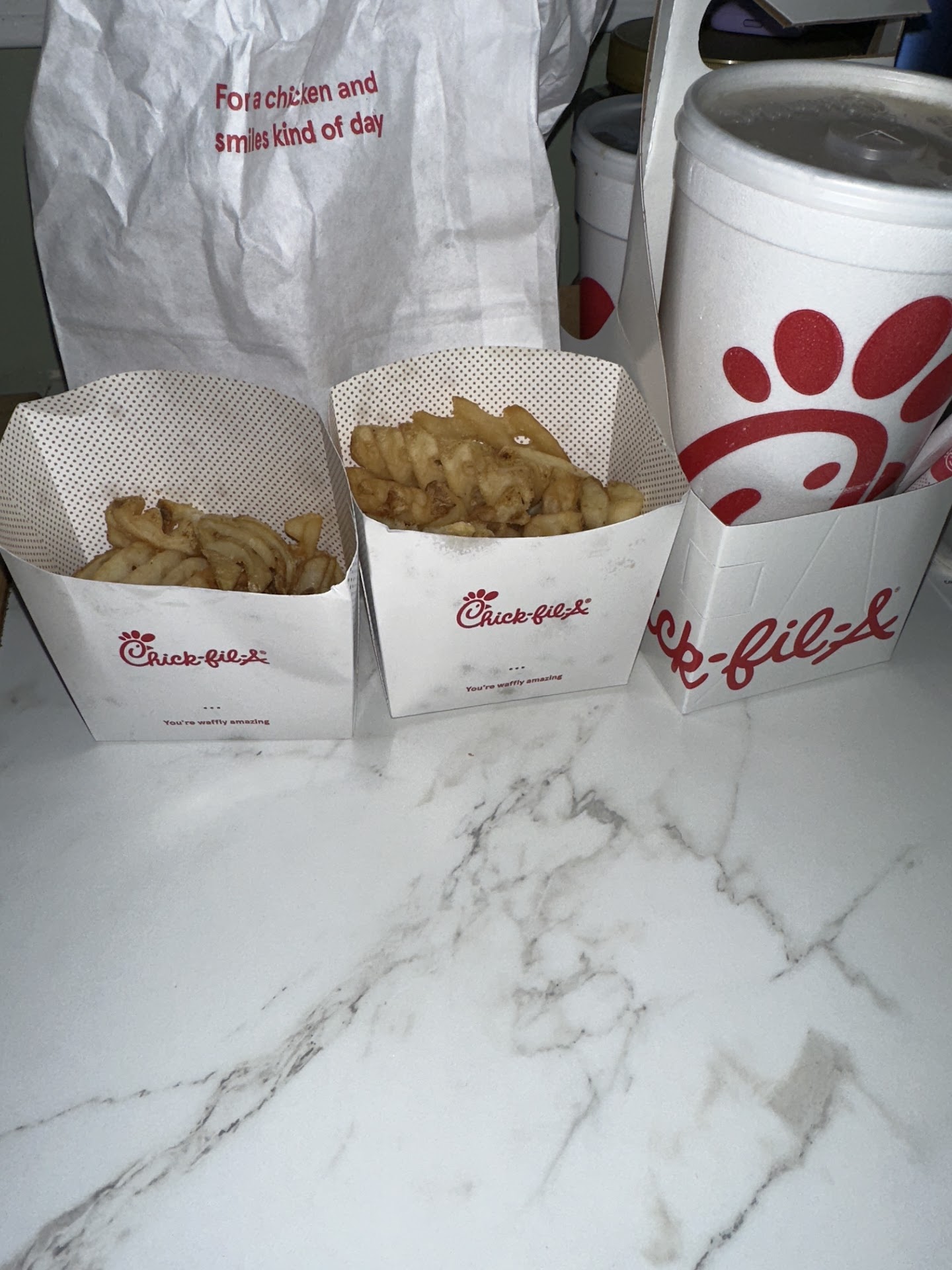 Read moreI am very disappointed in this restaurant. I am from out of town and we had a death in the family. The very same day I ordered delivery, from the Chic-fil-a app, and received half of my order. The door dash driver tried to get the staff to recheck my order before she left because she was aware it was a large order. Three staff members refused, stating it was complete. When I received my order, it indeed was incomplete. They had sent 7 fries & none of the rest of my food. I contacted Chic-fil-a who told me to call Door Dash (#1 placing the blame on DD). Again, I placed the order through the Chic-fil-a app, but contacted DD & they successfully submitted a redelivery of our missing items. Our fries were cold from the first order already, and considering the mood for the day (a death in our family), we were extremely disappointed.