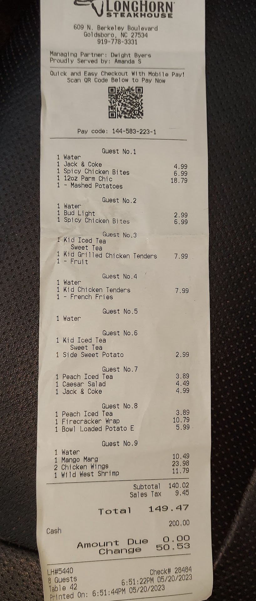 Read moreThis place is a joke! I love Longhorn so while visiting Goldsboro we decided to eat there. The service was horrible! We ordered flatiron steak and steamed broccoli the steak was the kids meal steak and three orders of broccoli was raw! Manager came over said he would go get me the right steak and recook the broccoli. Brought the same steak back out and another order of raw broccoli! It took 30 minutes for him to bring that back out. I had to ask for it would have probably sat back there even longer. Finally I just said let's go I'm not even gonna try to get the right food! So I ask for the bill 15 minutes later I get the bill. They charged me for drinks that are suppose to come with the kids meal. So the manager has to come back over to my table, then he takes my credit card to run the check and looses my credit card! After 30 minutes of searching the whole restaurant they finally find it! We we're at this restaurant for 2.5 hours. I get sorry we have caused you so much trouble tonight. No compensation or let me take something off your bill or nothing!!! Wow is all I can. I will never go back to...