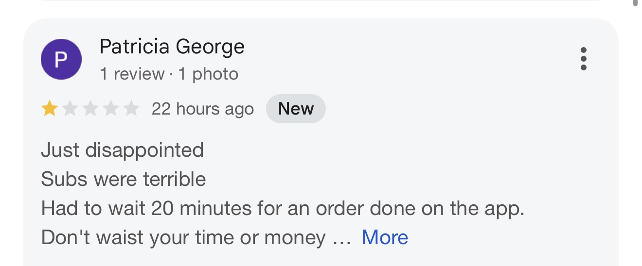 Ā Ā Ā Read moreI DO LIKE THIS LOCATION!!!! HOW EVER YESTERDAY I DID IN APP ORDER AND YOU WOULD THINK THEY WOULD MAKE YOUR SUB LIKE IF YOU WERE STANDING IN FRONT OF THEM. (GOD ONLY KNOWS WHAT THEY REALLY DO WHEN PREPPING YOUR FOOD WHILE NOT THERE). I ASKED FOR EXTRA JALAPENOS AND EXTRA BLACK PEPPER. MY SUB HAD 5 JALAPENOS NO LIE I COUNTED THEM :'(. ON HALF OF MY SUB THERE WAS HARDLY ANY STEAK ON IT. I ALSO PUT ON THE SPECIAL INSTRUCTIONS NO SOGGY TOMATOES OR BROWN LETTUCE. THE LETTUCE WAS NOT BROWN BUT THE TOMATOES WERE VERY SOGGY. I LOVE MY TOMATOES FIRM AND A SOGGY TOMATOE MAKES YOUR FOOD SOUR VERY DISAPPONITED. (I THINK THEY DO IT ON PURPOSE AND GET MAD WHEN YOU ASK FOR CERTAIN VEGGIES). NOT TO MENTION ONE OF THE EMPLOYEES AS SOON AS I WALKED IN SAID DOORDASH YEAH I HEARD HER JUST WANTED FOR HER TO REPEAT HERSELF. NORMALLY THEY WOULD SAY...