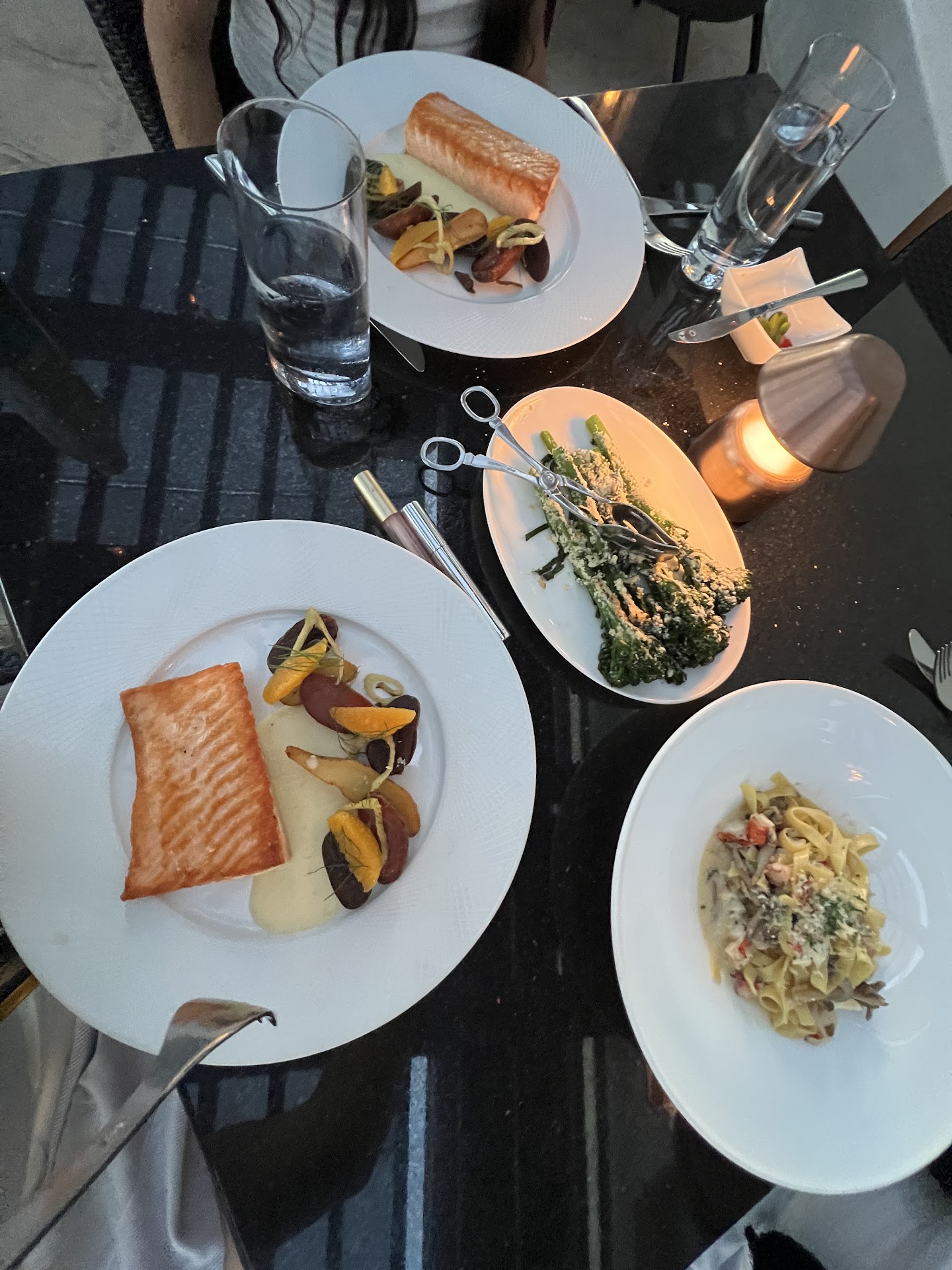 No liners for the bathrooms were stocked. That was the first fail. Second, our order took an hour and a half to come out, which really wasn’t an issue, but when I told our waiter we would be back in 5 to take picture on the patio, we ended up coming back from outside to all of our champagne and plates being gone, we were maybe gone 8 minutes. We told our waiter and he was very kind and said that there is a new bus boy helping out and that that was not okay and that he’d get us more champagne because ours had been taken along with all of our silverware and plates.