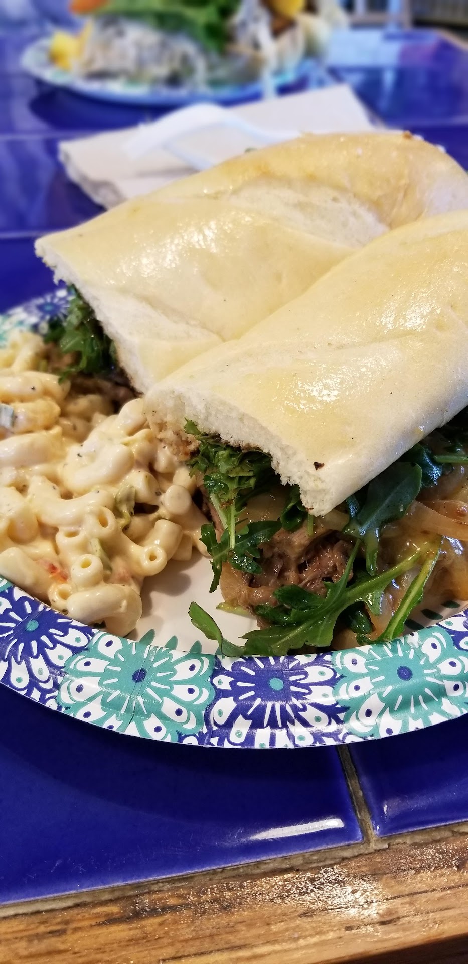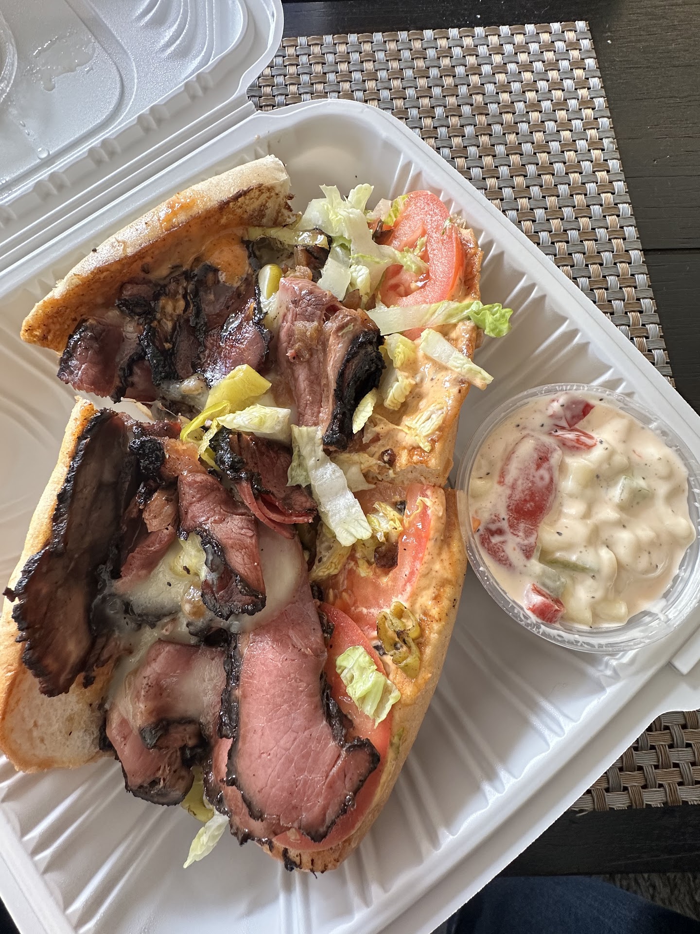 Now, the side mac salad... hmm, let’s just say it’s... meh. It's fine, I guess, but it’s basically just there to fill up space. The real star is the sandwich, so honestly, I’m probably going for the potato salad or chips next time. Yeah, I’m pretty sure that’s...
