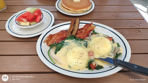 We live a few blocks away from this IHOP location and we usually came here often when the place was Itsuki Japanese restaurant. On our first visit IHop here, we had an okay dinner. However, on our second visit last Sunday, it wasn't great at all. I liked their concept of egg Benedict on top of spinach and mushroom, but the hollandaise sauce was missing a taste compared to other places. I ordered add on bacon and sausage sides with hope to bring up more flavor to my dish. However, my bacon wasn't crispy and the sausage had a somewhat "fallen out texture" like doughy/flour. Not sure what it was. My Benedict included my choice of side fruit, but the food runner failed to delivery it in whole. He accidentally dropped some fruit on the table when he placed my meal in front of me. He said oops, I am sorry and then left.😅 I guest he saved those fallen out fruit pieces on the table for me. 😂 My husband ordered orange juice, but it doesn't taste like real juice. It tastes just like powder drink.( It was like Vitamin C pills taste)