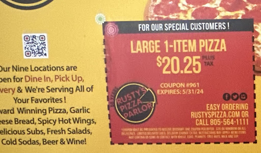 The pizza here is great, but the customer service is seriously lacking on the part of management. I placed an order over the phone (it’s now all digital voice apparently no human answering) my order was for a large half pepperoni half cheese pizza. I had a coupon for a large 1-item pizza for $20.25, the order total was $25.56 before the coupon. I get to the register and they say the coupon isn’t working, the manager lady comes and tells me yeah it’s not accepting the coupon because you have half cheese and half pepperoni not all pepperoni. I asked so I am getting charged more for requesting less pepperoni and she said yes. However the coupon states 1-item, I only got 1-item on the pizza, pepperoni. I didn’t ask for extra cheese. I’m sure there was a way for her to edit the pizza in the computer to say pepperoni only to accept the coupon, but that didn’t happen. The male cashier apologized and gave me a couple of free containers for ranch which are normally like .65 cents each, but come on Rusty’s you can do better than this. Is $5 the end of the world? No, but it definitely left a sour taste in my mouth on the inability to make the customer happy on the fly. I wasn’t asking for anything extra, but actually less. Maybe it was an issue with the all digital ordering and not being able to talk to a...
