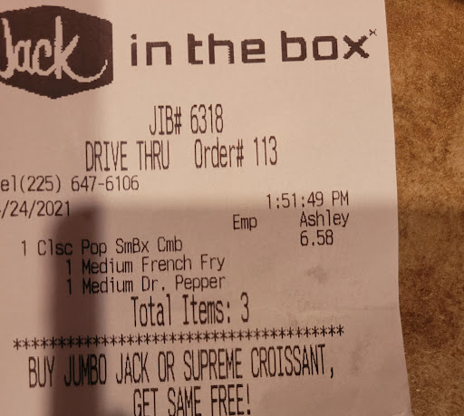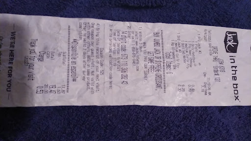 Ā Ā Ā Read moreTo start off with we stopped at this location on our way home because we do not have Jack in the Box where we live. The guy who took our order was very nice and kept apologizing for everything. So anything we tried to order we were told they did not have. When we finally found a few items they had they we were okay with we drive to the window and paid. After waiting there for a while we were given our food and told to have a good day. After driving off and getting on the Interstate we were greeted with burnt onion rings and Old cold dry Hamburgers. It was so bad that my dog would not even eat the food. The only thing that was consumable were the drinks. So after spending $40 here (which we got no receipt for) we had to throw out our food and get off at another exit and spend another $40 at Whataburger so we could actually eat. I've worked fast food before it's not difficult especially when you don't have more than half of your product in the store so you have a minimal menu. Everything should have been Hot and fresh. The employees lack of care in how they serve their product definitely shows. We were sadly disappointed and will not be returning when we come back to town. However Whataburger did not...