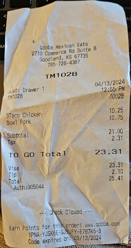 Read moreThere is no option for zero stars! Traveling through there wasn't much options for food. We stopped at Qdoba in Goodland. Where the place was a mess garbage over flowing. Employees on their phones while one gal working to serve everyone and run check out. She was out of most food yesterday and noone was cooking or even willing to help out. Manager short old guy was yelling and screaming horrible things at the employees. Even got furious with customers several walked out. If was complaining that workers quit or too lazy to do there job so we are out we are out don't like it I don't give a bleep. At that point several in line left. One shaggy looking guy dumped old food on new and it was clearly rock hard rice and said you have to eat old first. I give credit to the gal who was working hard to run the entire store while others didn't even blink from there phone. Now the manager talking to everyone like that is unbelievable he should not be in that store.Now to the disgusting part is employee who likes to do nothing but stand around grabs handfuls of food off the station a d eats it Hello Not allowed that is health hazard!!! I hope they do something about this store and that manager this is horrible to see. I won't return and I let many pole...