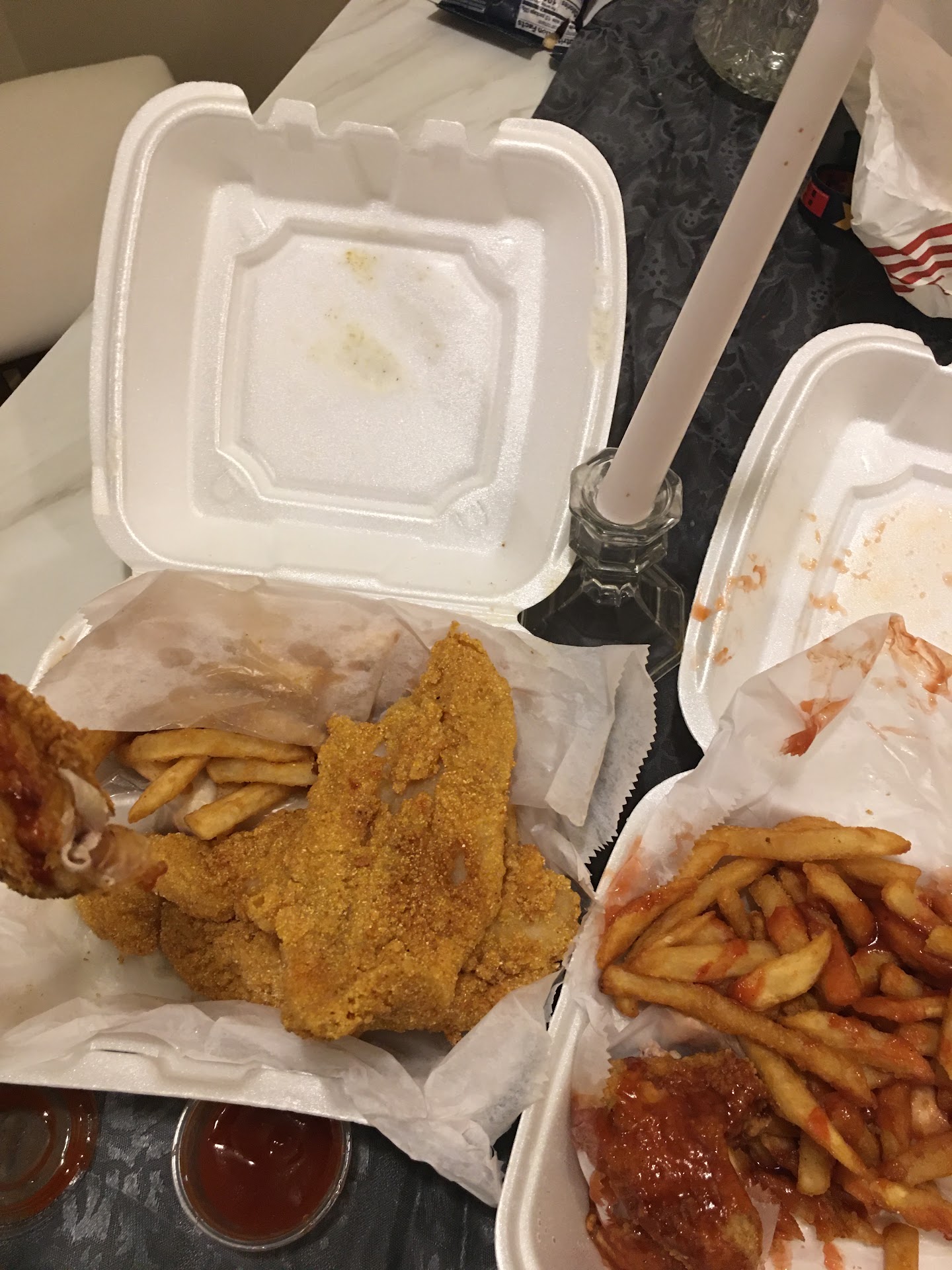 My next concern about this order was that the cleanliness of what I received my food in. This pan looks as if it was used to fry fish in my chicken even had meal on it.