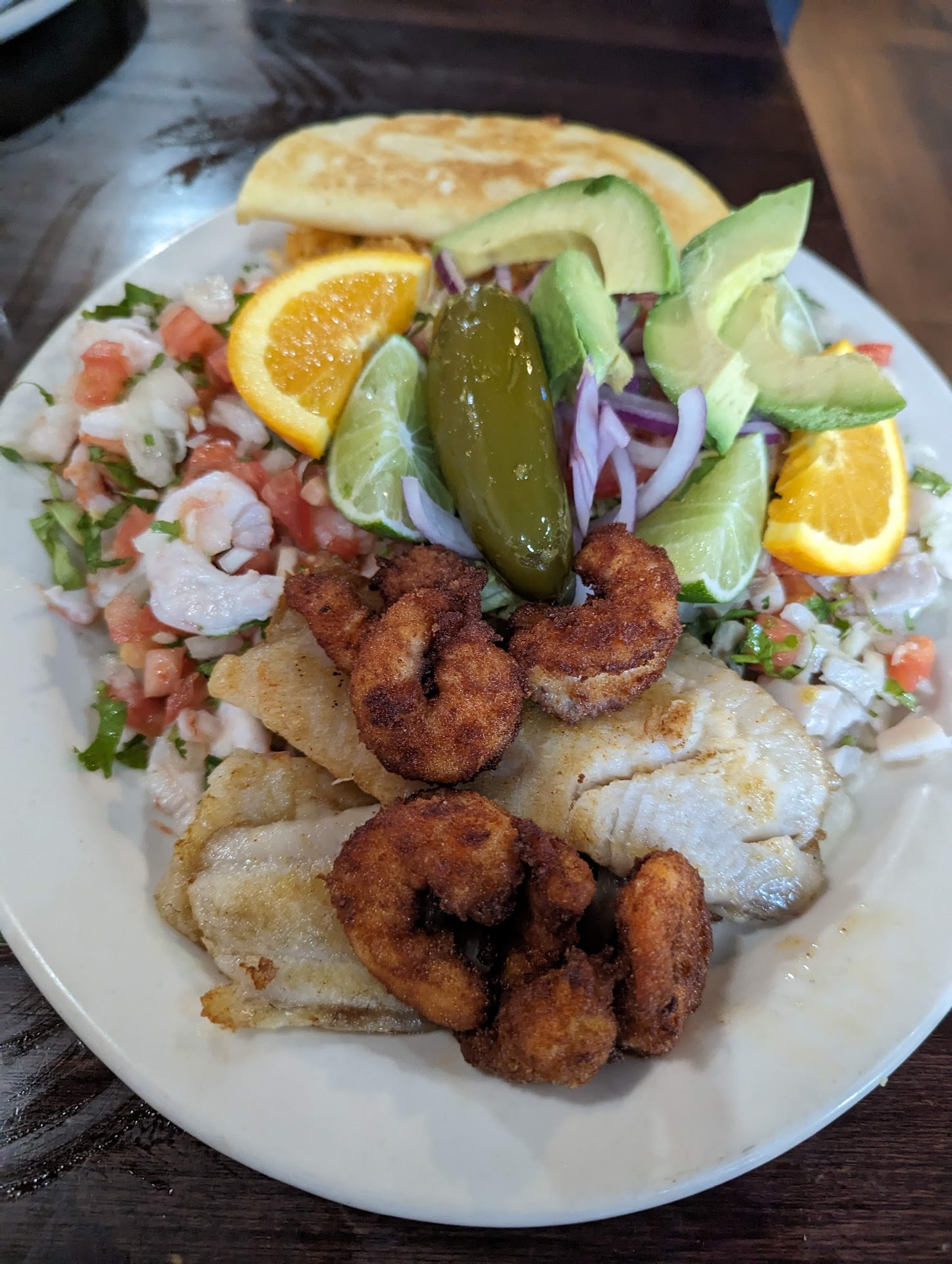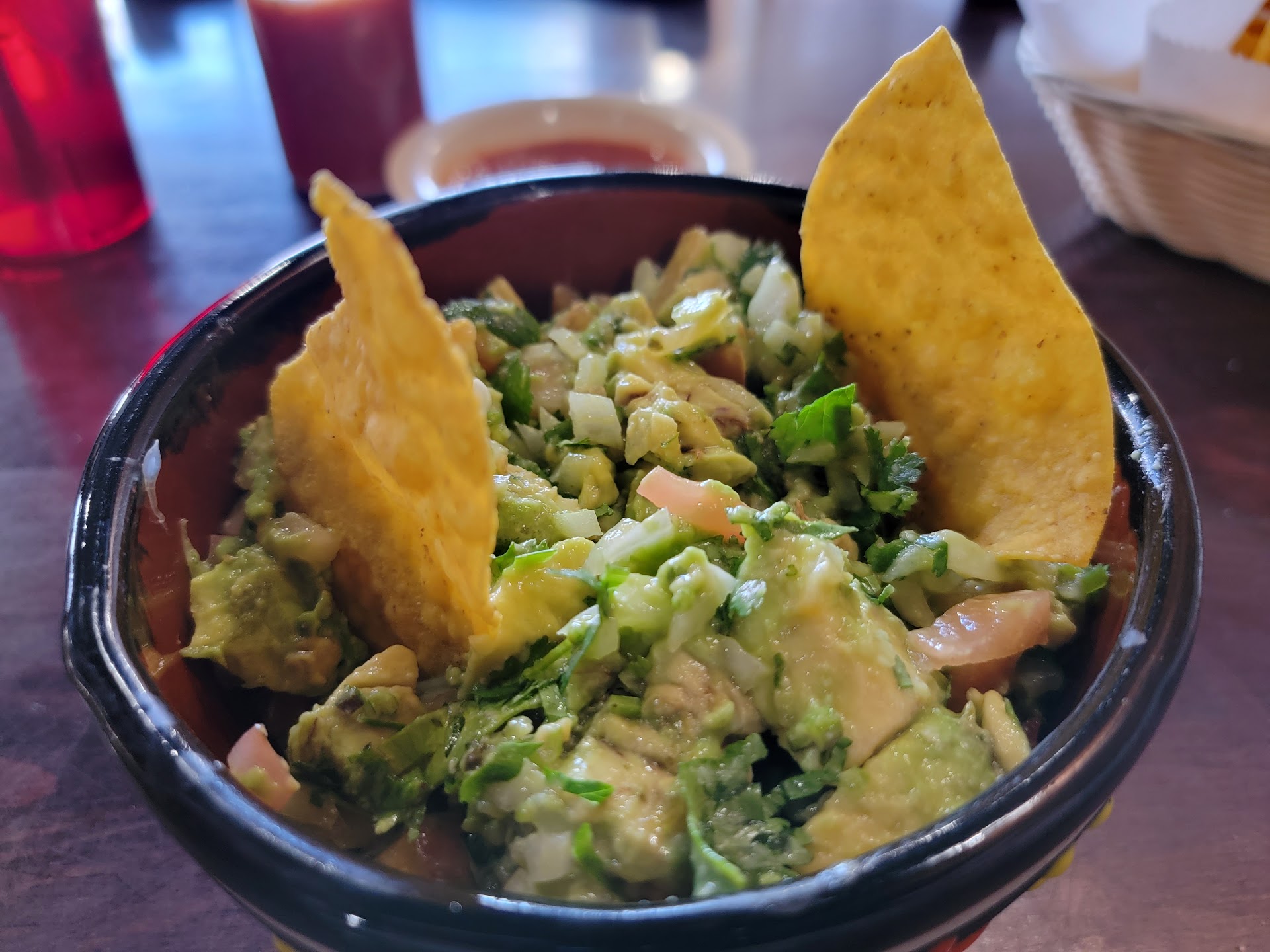 Food was very middle of the road.i had the Alambre (kinda like a Steak chicken and bacon fajita), and Guac Casera. Steak was very different from most.. skirt steak cut into little squares instead of strips.. it's texture slightly foreign. Chicken was ok, occasionally gristly. Onions weren't peeled right, a tough outer skin in my dish was unchewable. Overall seasoning was present, but not very prominent. Tea was unsweet with sweetener added, in the south we brew sweet tea... Guacamole Casera was very thick and hearty, with a strong raw onion component.. I'd call it good quality but I prefer a stronger citrus and cilantro profile.
