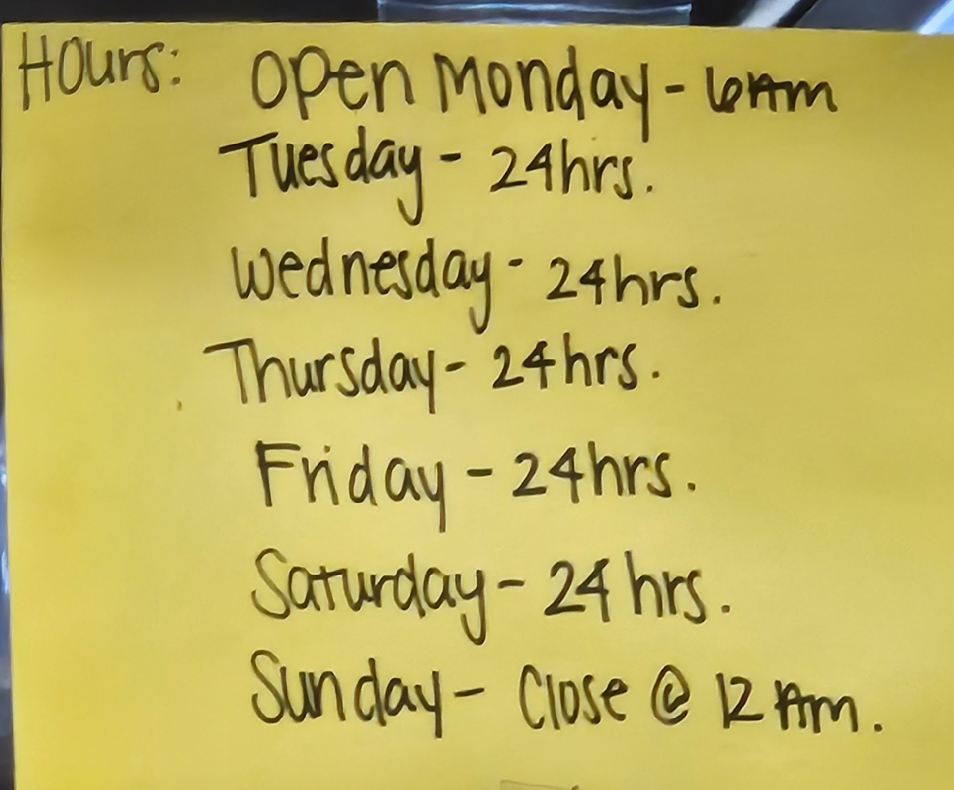 Hours. Every location I go to is completely 24 hours. Which is perfect for me bc I work overnight and EVERYTHING is closed by my lunch time & end of my shift. This location... no. It has a BIG sign saying 24 hours, but almost every morning, the lights are off, and there's no one there. Like today, it says it'll be open at 6 am. It is currently 5:50 a.m., and I don't see a single person inside prepping anything, so I know they aren't gonna open at 6 am. The ONLY reason I keep coming to this one is because it's literally like a 5-minute WALK from my house. I sometimes just drive down to Cotton Lane and go to that location instead.