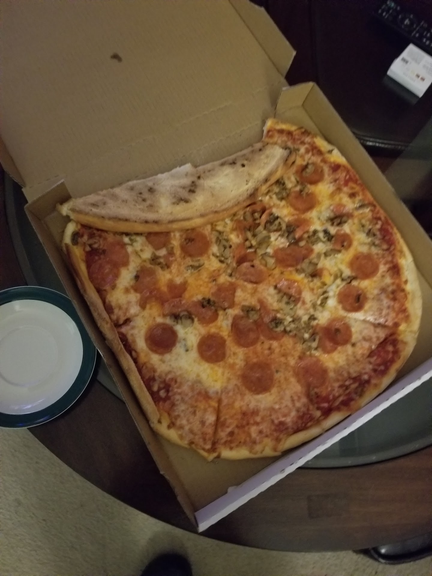 The pizza came with no sausage, no onion, no mushroom and no green pepper. You can judge from the picture as to whether I got "extra cheese" that was to come standard with the pizza. I absolutely did not get "extra pepperoni that I paid an extra $1.95 for. Yes, somehow I did get the "extra olives" that I paid &1.95 for...(only plus coming from this review).