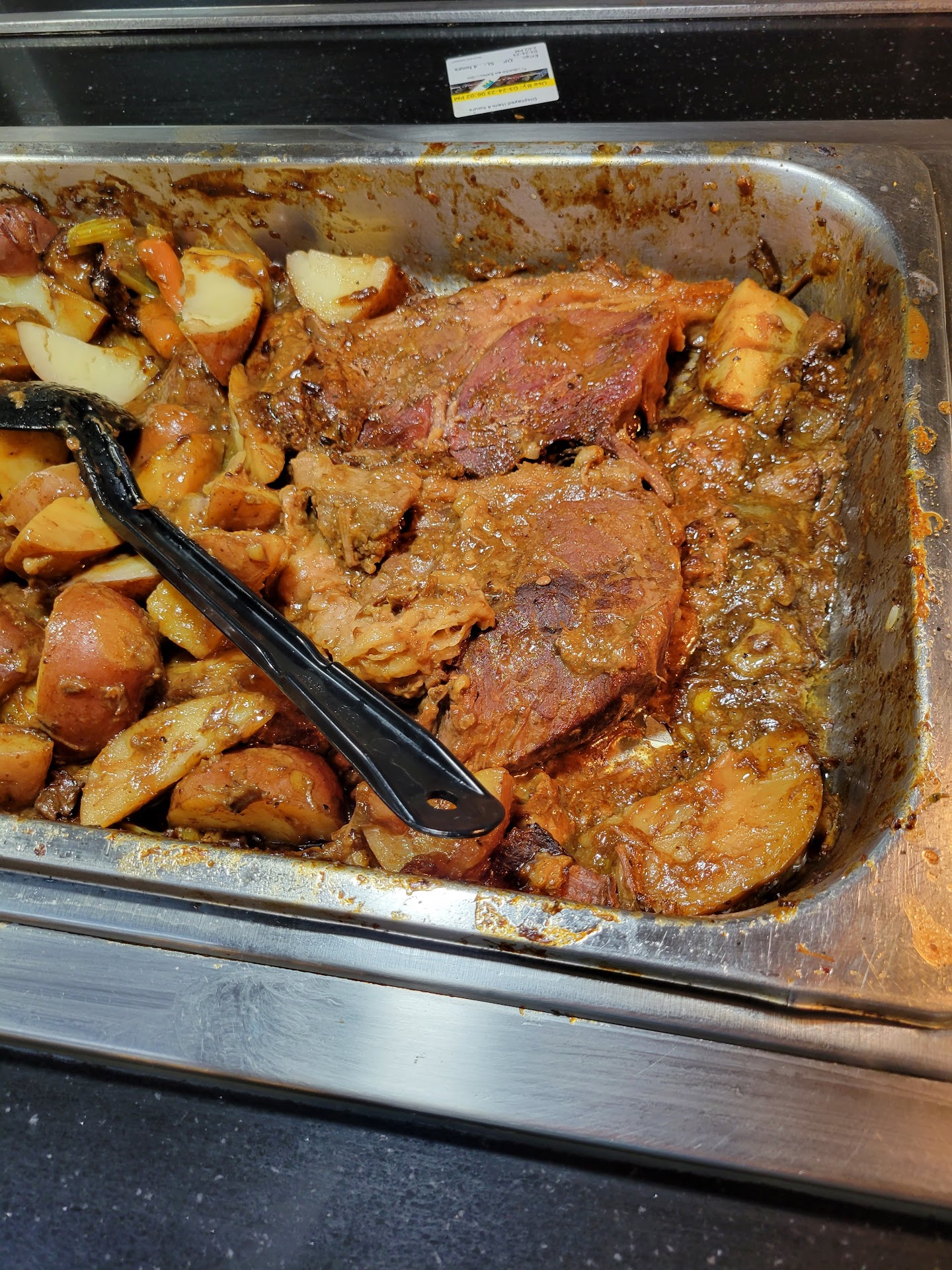 This was the worst food I had ever had at a Golden Corral. We were late for supper, so we chose GC as food would be ready to eat. About 7:50 pm when we arrived, open until 9:30. I have 2 "go-to's" at GC - fish & chips and pot roast with mashed potatoes and gravy. I got one piece of fish, that was all that was there, it never got refilled. The chips must have been there for hours, barely warm and limp...awful. The pot roast was uneatable. See the photo, what was there were large chunks of hard dried up roast. A plastic spoon to try to dig into it wasn't happening. I tried but it was too hard to try to get any chunk off with it. Thought I would have some BBQ ribs, they were so overcooked and dry that I ate one and threw others away. When we arrived, I noticed that the carved ham was down to crumbs, literally. Went back to get some and it turned into sausages. Took a piece of sausage, barely luke warm, yuk. Oh, started with a chicken noodle soup, it was barely warm and watered down. Gave up and went for dessert. One piece of brownie left, all dried up. Got 1 nice piece of cake and some pudding, these were the highlights of the meal. Oh, and it was a Friday so we paid extra. I asked what they added to the buffet for the extra charge and was told they just charge extra on the weekend. The water glasses at the table got refilled but the paid soft drinks did not. We drove 1/2 hour to get here, we were really hoping to find a new GC we liked as our local one closed due to Covid. The only one I have found that was good is about an hour drive âšď¸. Might have to just give up on my "favorite"...