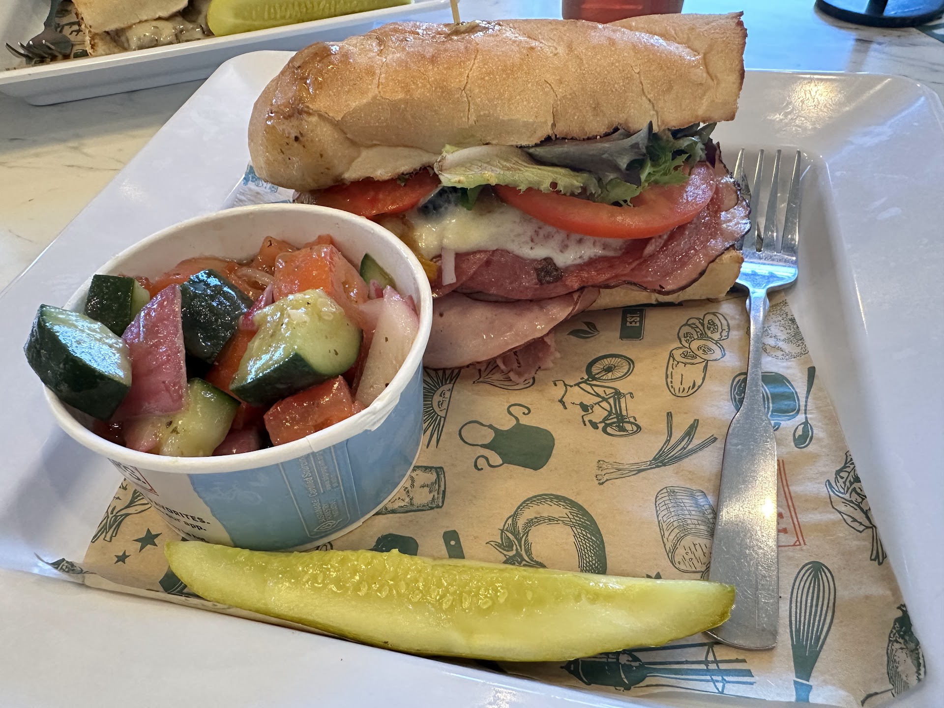 Read moreI ordered The Italian , and it was fantastic. The sandwich was loaded with Black Forest ham, salami, and provolone, all brought together by the tangy Olive Oil & Balsamic Vinaigrette and a kick of spicy brown mustard. The house roasted multicolored peppers, spring mix, tomato, red onion, and black olives added a fresh, flavorful crunch. All of this was served on a soft baguette that held everything together perfectly. It even came with a pickle spear and a side. I opted for the cucumber tomato salad, which was light, refreshing, and a nice complement to the richness of the sandwich. I paired it with their tea to complete the meal.