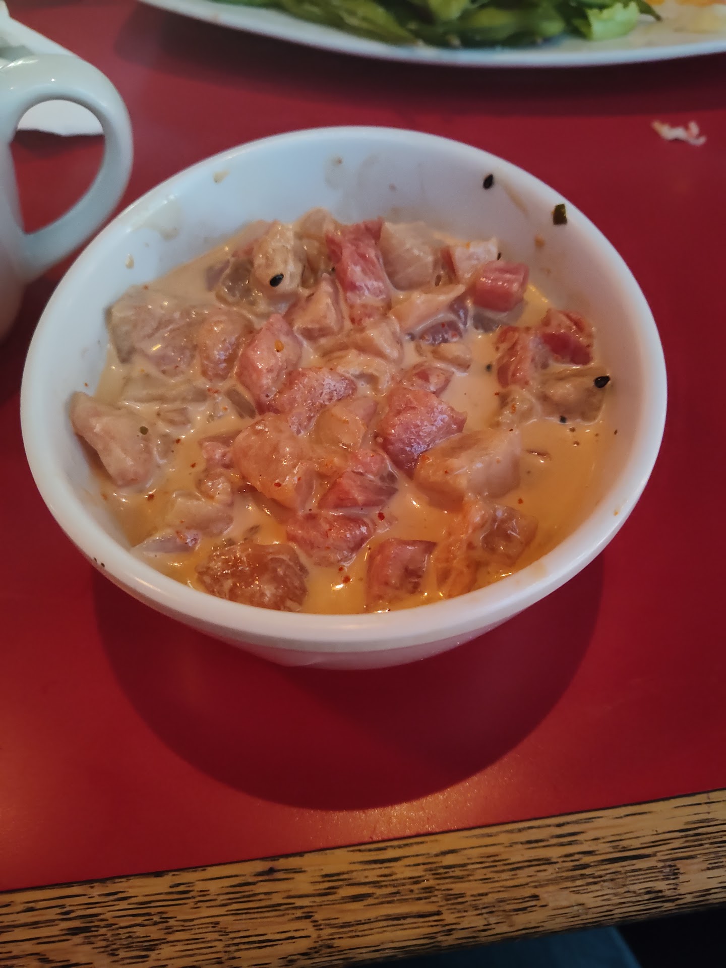 Once finished, our main dishes arrived. A sashimi salad for myself and beef yakisoba for my husband. Whatever spicy mayo based dressing the sashimi salad was in, it was swimming in it. Absolutely swimming in this dressing. It was a little impressive how much of it there was.