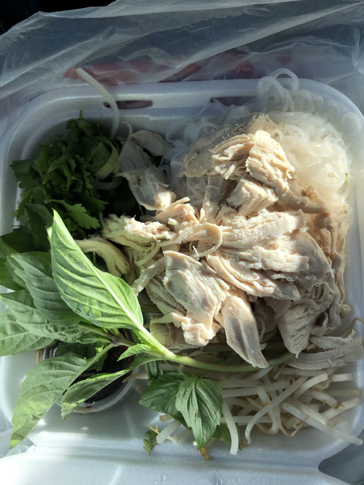 Pros: Ordered a simple chicken pho to go, which is a good portion for under 9.00 after tax but before tip. They gave me a nice glass of ice water and lime wedge and were happy to chat it up between customers while I waited. The broth is not pictured, but the server/expediter explained that when you get home or wherever and are ready to eat, just heat the broth up as hot as possible in the microwave (you will soon learn why) and then toss in all the side fixings. NOTE: If taking it home, you will need a bowl large enough to hold the broth and all of the fixings. If you use the styrofoam cup they provide, broth will flow over.