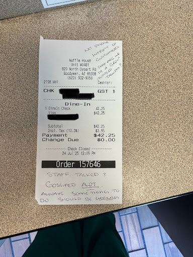Read moreHi my name is Adrian Almaraz from El Paso Texas where yâall donât have a Waffle House location. I feel like the only way you can all make up for this incident is if y'all made a Waffle House location in El Paso Texas. It was my first time eating at a Waffle House at 820 N Dysart Rd, Goodyear, AZ 85338 where I was coming from California. The servers were so nice but when I got my hashbrown bowl with chicken I found a hair in it I didnât want to make a big deal about it so I told her and they re did my bowl with no problem. I suggest the employee should wear hair nets because I donât know if Iâm the first this happen to but this was ridiculous for my first time being at a Waffle House. This includes also the fact there was a fly in the building that constantly wanted to eating my peanut butter chocolate chip waffles. I noticed as well that the bottom of the grill where they keep the little pans where the grill is at was a bit dirty with little pieces of hash brown. At the end I felt obligated to tip the lady that served me because she was so nice but I didnât even get a receipt because I had to do a different transaction to tip her which I didnât mind but I Just felt like I couldnât complain even though I wanted to make and exception for paying for the hash-brown blow since it had a hair but like I said I didnât want to make a big deal about it. I also didnât like that new steak plate you all advertised in the menu looks nothing or compares for the size shown in the picture of the menu but I still ate it because it look good and I was hungry. overall the service was good even though I couldnât keep my receipt I donât know if they did that because they didnât want me to-scan the QR code to do this survey. OVERALL the food was delicious and minor details need to be changed. PLEASE MAKE A WAFFLE HOUSE IN EL PASO TEXAS THE FOOD IS SO GOOD BETTER THAN IHOP EVERYONE I TALKED THEIR IN THE WAFFLE HOUSE SAID THEY THOUGHT THEIR WAS SOME IN TEXAS AND I told themâ. Not in my part of Texas...