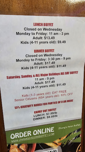 Read moreI had high expectations for Zhang's Asian Buffet considering I had been waiting around in the area for what this new place had to offer. They had a wide variety of Asian style foods such as sushi, fried rice, dumplings, lomein, flounder fish, and other things. The disappointing part was the food itself. I grabbed myself a standard plate of rice, general tsos chicken, dumplings and some crab Rangoon. I sit down and start with some rice. That wasn't terrible it definitely needed soy sauce or something. Next was the GTC it was harder than a damn rock, I needed so much strength to get into it it was almost unbearable, I gave up on that. Rangoons: cold but still good, Dumplings, cold but also half decent. Me and my sister only had one plate of food. I took dessert to-go (Which was also not great.) Our wait staff was very nice though checked in on us and asked us if we needed anything and they were very sweet. Another thing to mention was the atmosphere, it felt very Chinese new year, and also a little tacky and flashy all at the same time. The place was lined with those LED lights that teens have in their room and they are constantly changing color. Just a very awkward place. I will try again in a few months when they have their...