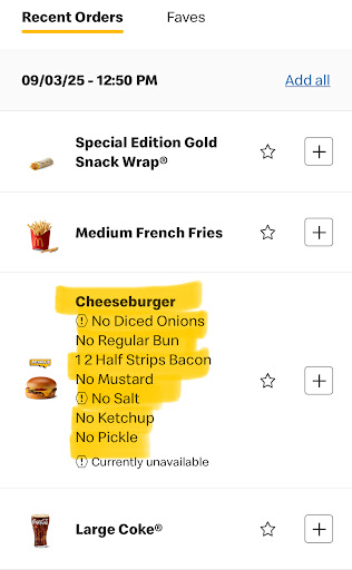 May 3rd 2025 super slow service. Didn't give me a drink when I asked for a drink cup to get my drink. I got an eye roll and an attitude from employee. Which is ridiculous. Also the automated system on the inside didn't give me a receipt. When I told them instead of giving me a receipt they just told me what my order number was. Ordered lemonade but found out you cannot get lemonade besides, behind the counter was not going to battle the employee that rolled their eyes at me over a drink will not be coming back to this location